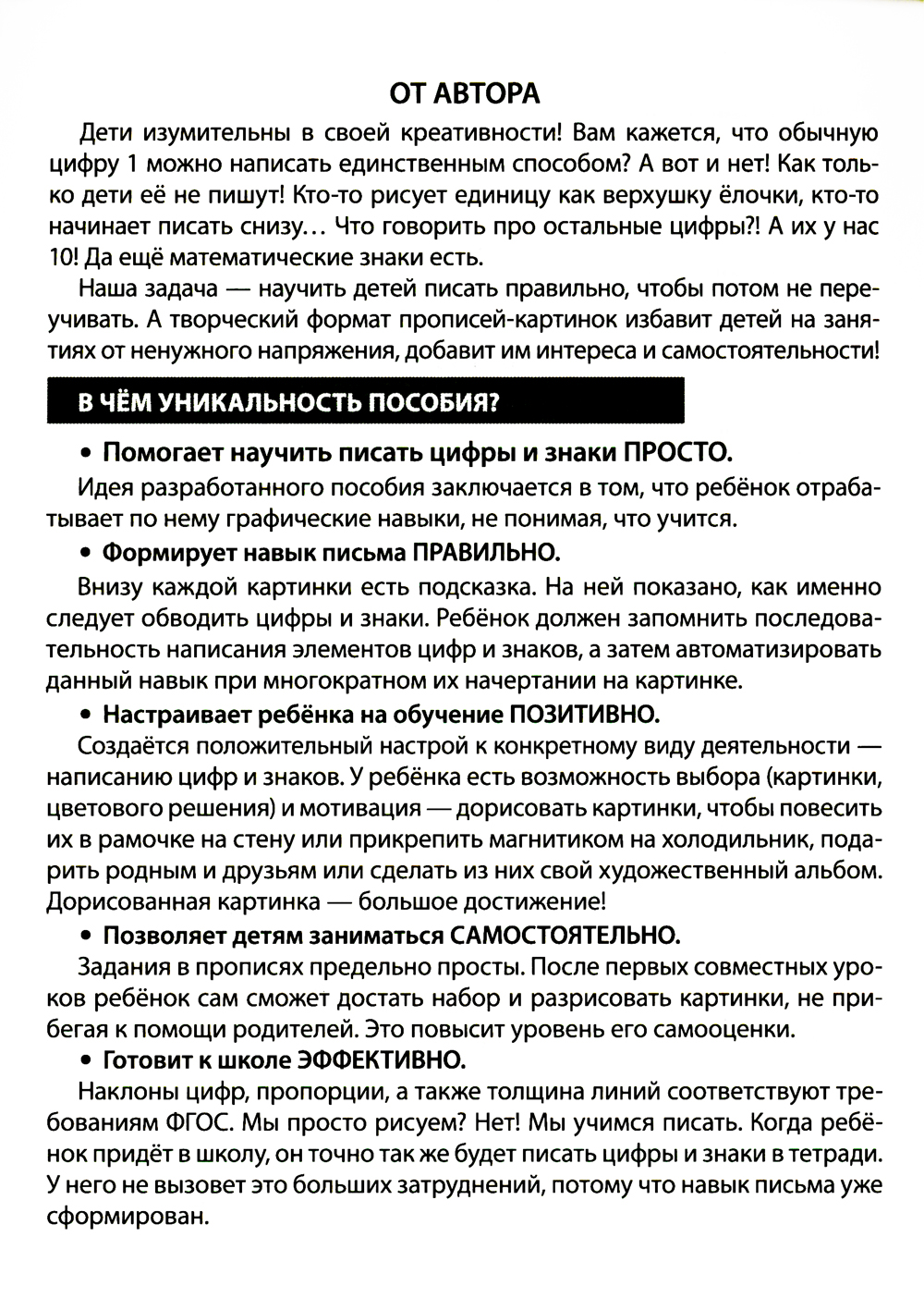 Дети изумительны в своей креативности! Вам кажется, что обычную цифру 1 можно написать единственным способом? А вот и нет! Как только дети её не пишут! Кто-то рисует единицу как верхушку ёлочки, кто-то начинает писать снизу... Что говорить про остальные цифры?! А их у нас 10! Да ещё математические знаки есть. Наша задача - научить детей писать правильно, чтобы потом не переучивать. А творческий формат прописей-картинок избавит детей на занятиях от ненужного напряжения, добавит им интереса и самостоятельности!| Издательство | Творческий центр Сфера |