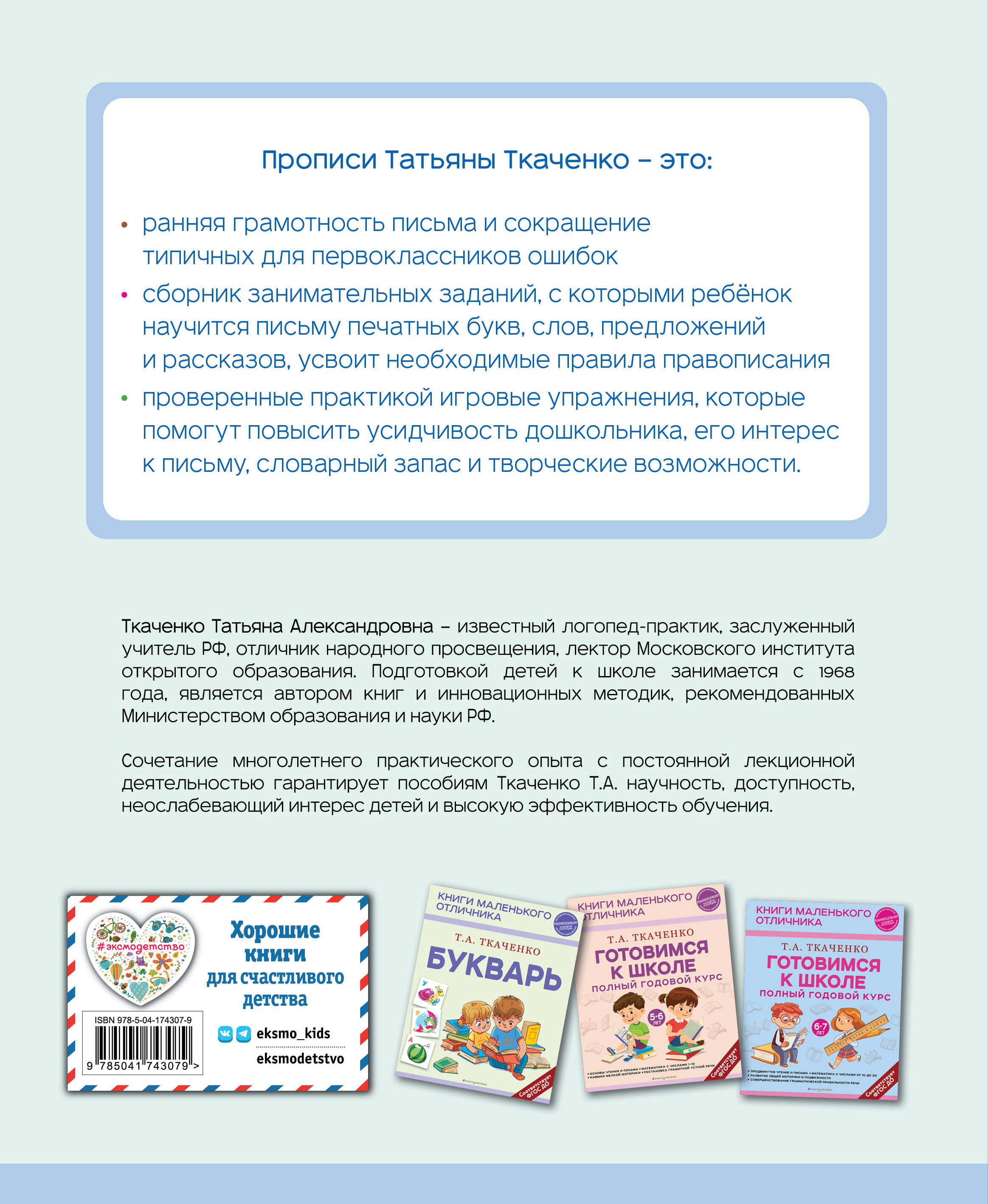 Освоение письма по системе Ткаченко начинается с печатных букв, что, согласно логопедической теории, является правильной основой для постановки руки. Прописи от Татьяны Ткаченко - вдумчиво разработанное, проверенное пособие по первому письму для будущих школьников. Ребенок легко освоит навыки написания букв и слов с помощью заданий, поданных в игровой форме. Прописи станут подспорьем в обучении грамотности и важной частью системы подготовки дошкольника. «Чтобы вести ребенка за собой, нужно встать не впереди, а рядом с ним», - считает Татьяна Ткаченко, логопед высшей квалификационной категории и заслуженный учитель РФ. Пособия, разработанные для подготовки дошкольников, уже успели завоевать любовь как родителей, так и педагогов по всей России. Татьяна Ткаченко воспитала не одно поколение дошколят и вашему ребенку поможет качественно подготовиться к школе с помощью комплекта из 5 книг-пособий. • Полные годовые курсы, включающие все необходимое для подготовки к школе. • Занятия длятся 15 минут - оптимальный объем для постепенного приучения дошкольника к нагрузке. • Структурированная информация, постепенное нарастание сложности. • Комплексная система, проверенная не одним поколением дошколят. Тэги: учимся писать, в помощь первокласснику, пишем без ошибок, ранняя грамотность, рабочая тетрадь.| Издательство | ООО "Издательство "Эксмо" |