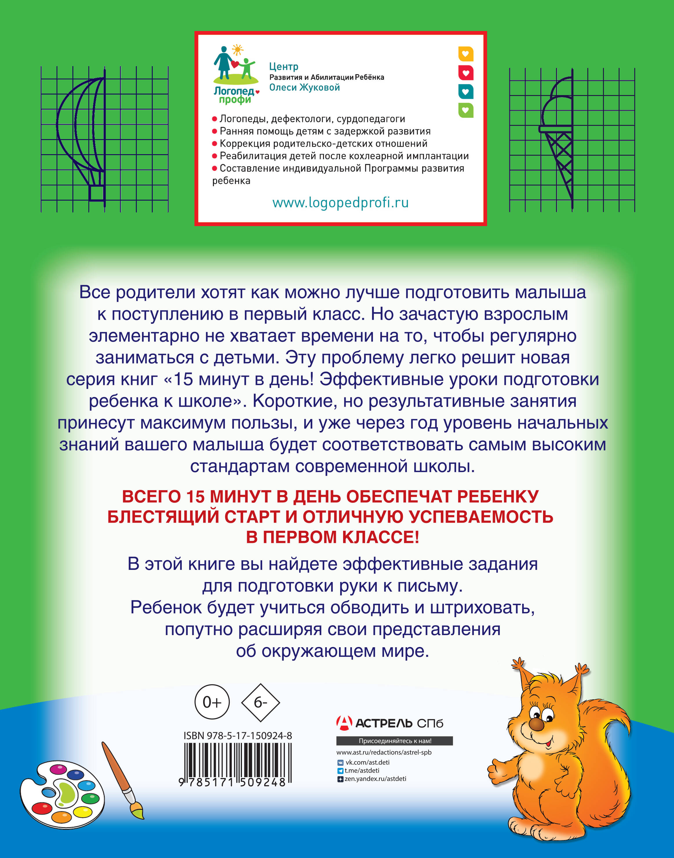 Книга подготовлена опытным логопедом-практиком специально для помощи родителям и педагогам в развитии и обучении детей дошкольного возраста. Занимаясь по этой книге всего 15 минут в день, родители смогут значительно поднять уровень подготовки ребенка к школе в течение короткого времени. Выполняя упражнения, малыш подготовит руку к письму, потренирует мышление и внимание, разовьет воображение и речь. Простые увлекательные задания, составленные с учетом познавательных способностей детей дошкольного возраста, облегчат ребенку освоение новых навыков, а веселые картинки превратят скучные «уроки» в полезную и занимательную игру.| Издательство | АСТ |