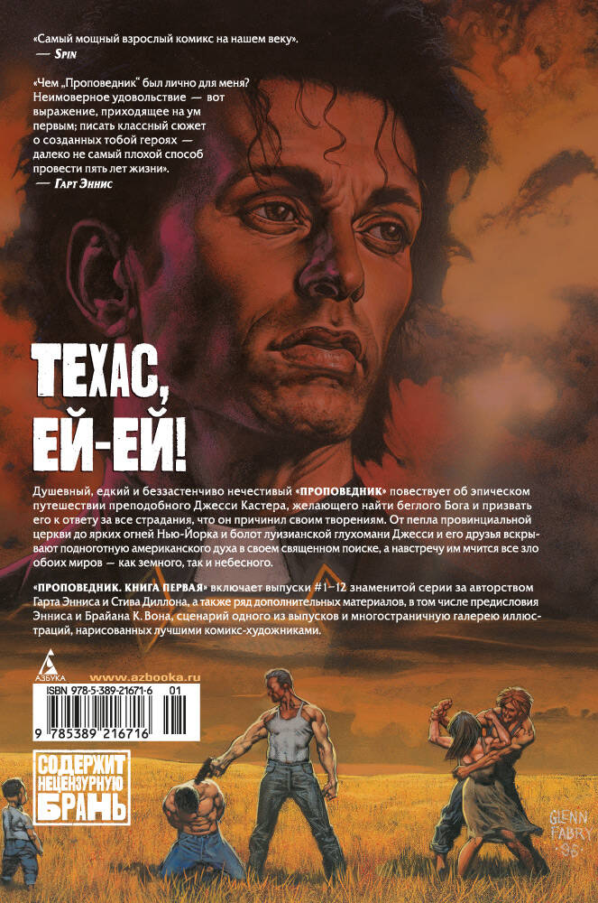 Техас, ей-ей! Душевный, едкий и беззастенчиво нечестивый "Проповедник" повествует об эпическом путешествии преподобного Джесси Кастера, желающего найти беглого Бога и призвать его к ответу за все страдания, что он причинил своим творениям. От пепла провинциальной церкви до ярких огней Нью-Йорка и болот луизианской глухомани, Джесси и его друзья вскрывают подноготную американского духа в своем священном поиске, а навстречу им мчится все зло обоих миров - как земного, так и небесного. "Проповедник. Книга первая" включает выпуски #1-12 знаменитой серии за авторством Гарта Энниса и Стива Диллона, а также ряд дополнительных материалов, в том числе предисловия Энниса и Брайана К. Вона, сценарий одного из выпусков и многостраничную галерею иллюстраций, нарисованных лучшими комикс-художниками.