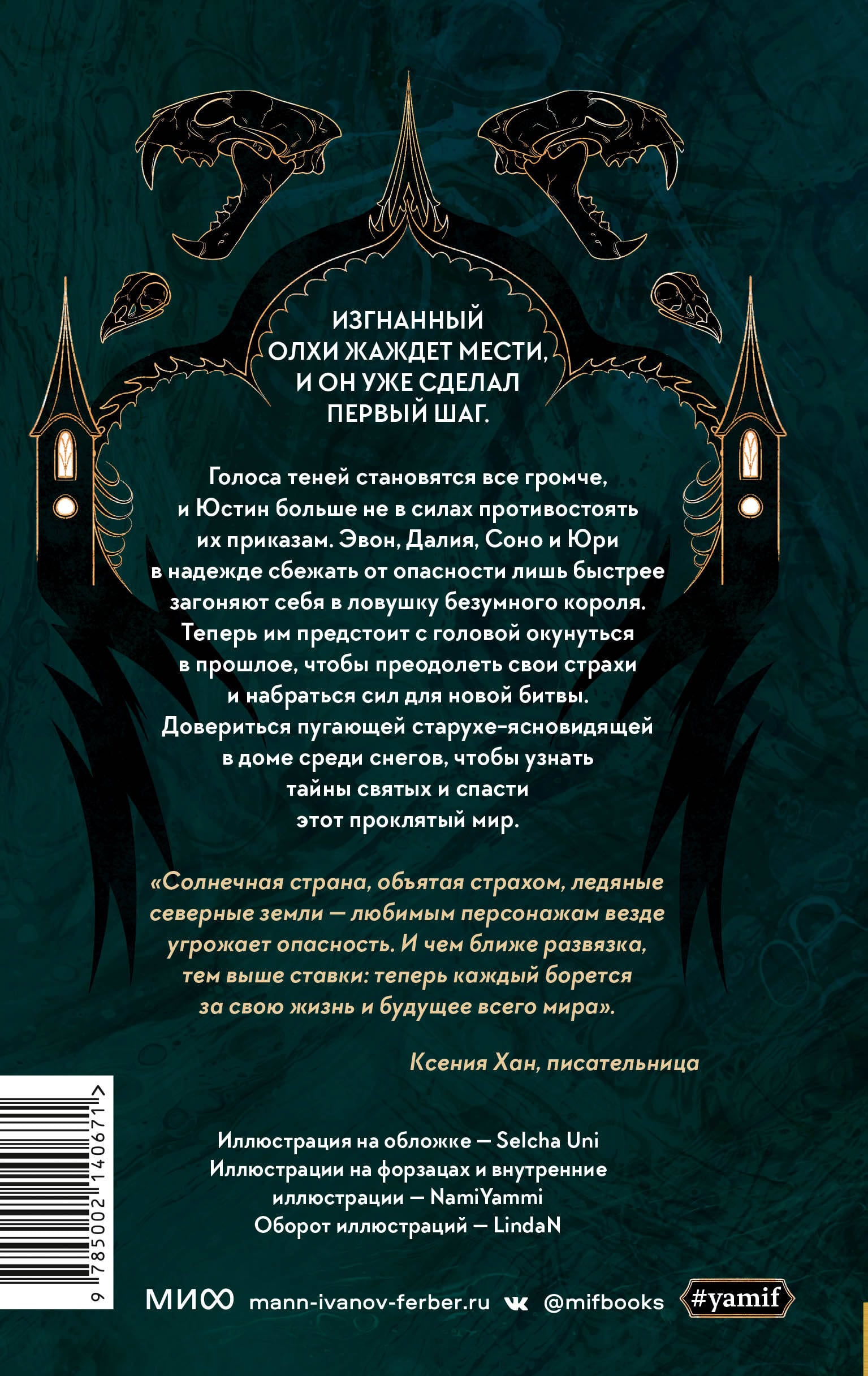 Изгнанный олхи жаждет мести... И он уже сделал первый шаг. Голоса теней становятся всё громче, и Юстин больше не в силах противостоять их приказам. Эвон, Далия, Соно и Юри в надежде сбежать от опасности лишь быстрее загоняют себя в ловушку безумного короля. Теперь им предстоит с головой окунуться в прошлое, чтобы преодолеть свои страхи и набраться сил для новой битвы. Довериться пугающей старухе-ясновидящей в доме среди снегов, чтобы узнать тайны святых и спасти этот проклятый мир. Для кого эта книга: Для тех, кто ждал продолжения потрясающего "Пира теней". Для поклонников темного и стильного фэнтези. Для тех кто любит авторскую мифологию, мрачную атмосферу, сделки с древними богами и опасные приключения.