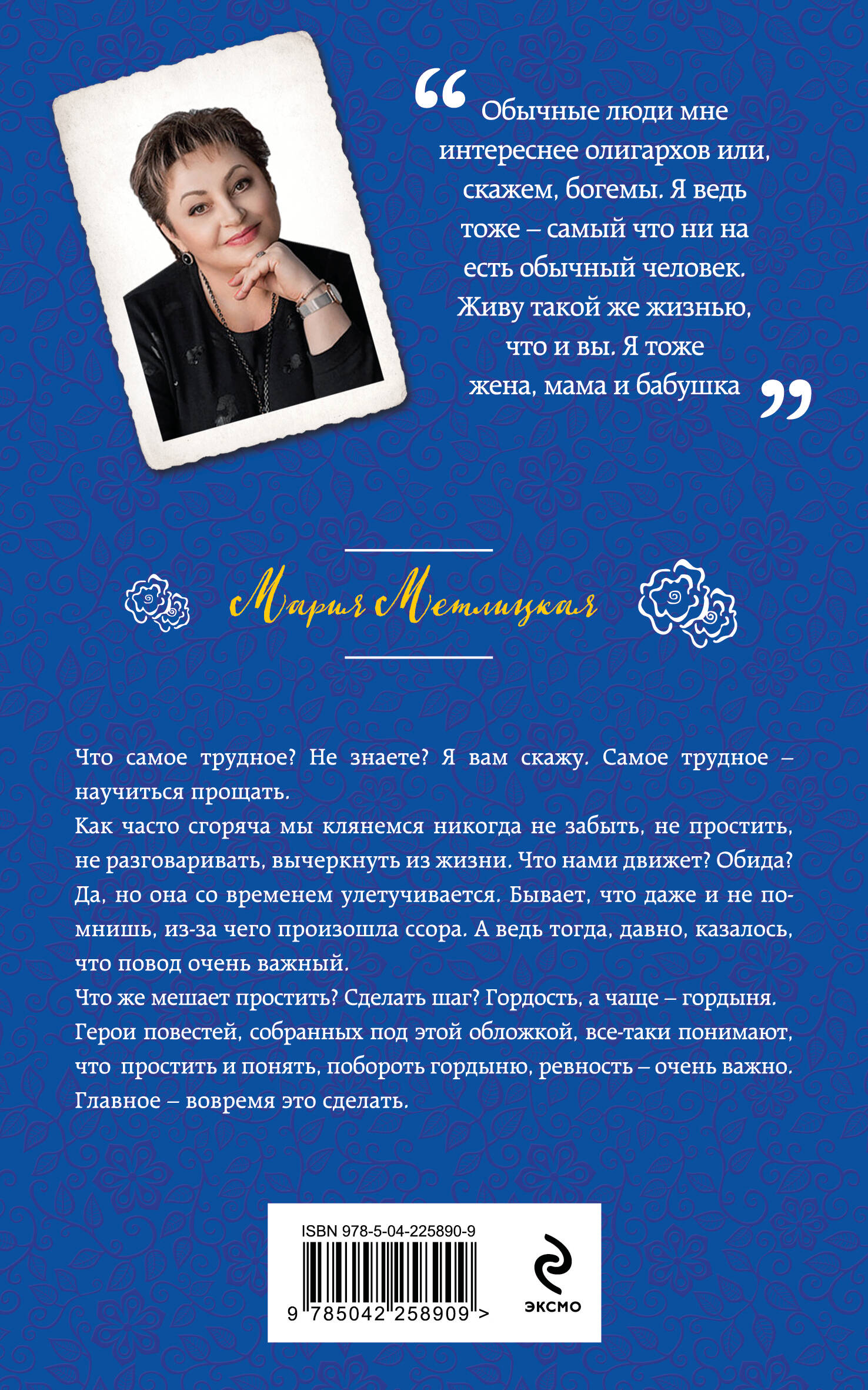 Что самое трудное? Не знаете? Я вам скажу. Самое трудное - научиться прощать. Как часто сгоряча мы клянемся никогда не забыть, не простить, не разговаривать, вычеркнуть из жизни. Что нами движет? Обида? Да, но она со временем улетучивается. Бывает, что даже и не помнишь, из-за чего произошла ссора. А ведь тогда, давно, казалось, что повод очень важный. Что же мешает простить? Сделать шаг? Гордость, а чаще - гордыня. Герои повестей, собранных под этой обложкой, все-таки понимают, что простить и понять, побороть гордыню, ревность - очень важно. Главное -вовремя это сделать.| Издательство | ООО "Издательство "Эксмо" |