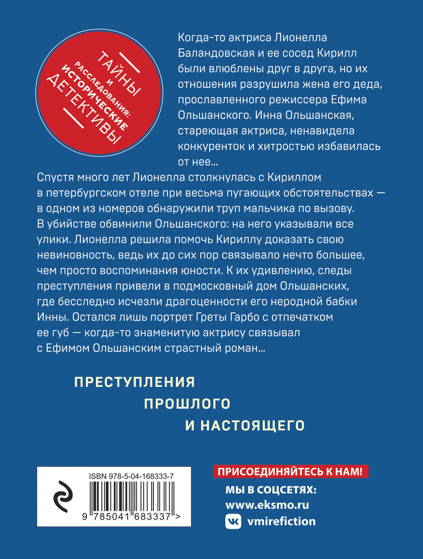 Когда-то актриса Лионелла Баландовская и ее сосед Кирилл были влюблены друг в друга, но их отношения разрушила жена его деда, прославленного режиссера Ефима Ольшанского. Инна Ольшанская, стареющая актриса, ненавидела конкуренток и хитростью избавилась от нее… Спустя много лет Лионелла столкнулась с Кириллом в петербургском отеле при весьма пугающих обстоятельствах - в одном из номеров обнаружили труп мальчика по вызову. В убийстве обвинили Ольшанского: на него указывали все улики. Лионелла решила помочь Кириллу доказать свою невиновность, ведь их до сих пор связывало нечто большее, чем просто воспоминания юности. К их удивлению, следы преступления привели в подмосковный дом Ольшанских, где бесследно исчезли драгоценности его неродной бабки Инны. Остался лишь портрет Греты Гарбо с отпечатком ее губ - когда-то знаменитую актрису связывал с Ефимом Ольшанским страстный роман… В остросюжетных романах Анны Князевой расследуются преступления, следы которых уводят в прошлое и позволяют пролить свет на его загадки. Вслед за героями вы отправитесь навстречу старинным тайнам и увлекательным приключениям!| Издательство | Эксмо |