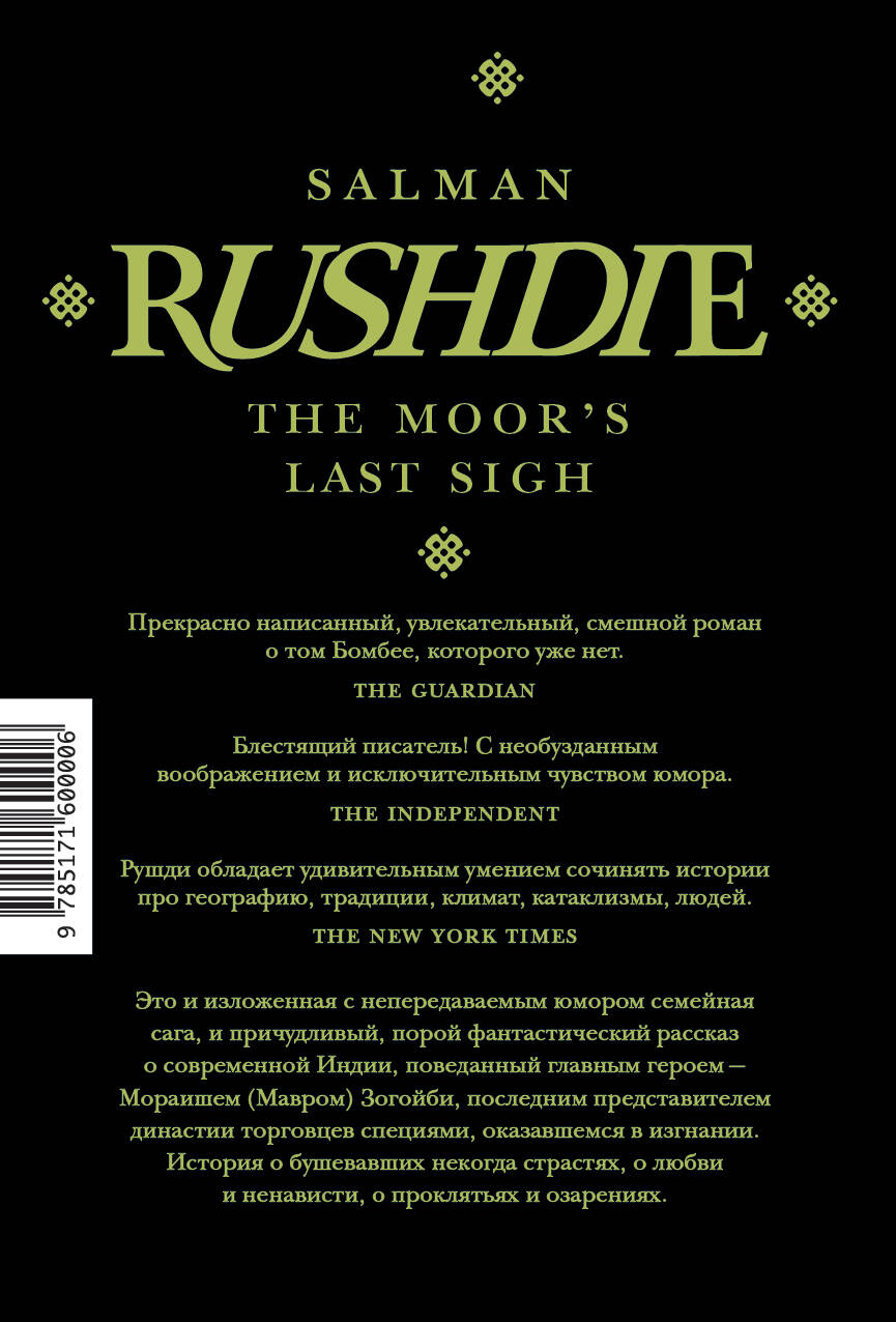 Салман Рушди - всемирно известный британский писатель индийского происхождения, автор 16 книг, переведенных более, чем на 40 зыков. Его роман «Дети полуночи» получил Букеровскую премию, «Букера Букеров», а в 2008 году был назван лучшей книгой за 40 лет существования премии. «Прощальный вздох мавра» - пятый по счету роман писателя, удостоенный Уитбредовской премии (1995) и премии Aristeion (1996), а также вошедший в шот-лист Man Booker Prize. Его главный герой Мораиш Зогойби, по прозвищу Мавр, рассказывает историю своей семьи - четырех поколений династии торговцев специи, ведущих свой род от португальского путешественника Васко да Гамы. Но да Гама - не единственный великий предок. Среди своих предшественников Мавр называет Боабдиля, последнего эмира Гранады - того самого, в честь которого назван знаменитый гранадский перевал «Прощальный вздох мавра». Именно отсюда бросил он свой прощальный взгляд на захваченную неприятелем Альгамбру. Символично, что в самом начале романа мы видим Мавра в андалузском (правда, вымышленном) городке Бененхели, где он начинает свою семейную сагу с истории своей матери - выдающей художницы Ауроры, женщины с властным характером и острым, словно индийские специи, языком… «Прощальны вздох Мавра» объединил в себе всё то, за что во всем мире ценят прозу Рудши: реальность и вымысел, традиции и современность, любовь и ненависть, страсти и добродетели, победы и поражения… У вас не будет иного выхода, кроме как влюбиться в эту удивительную книгу, с головой окунувшись в волшебную и манящую атмосферу Бомбея, пропитанного ароматами цветов и специй.
