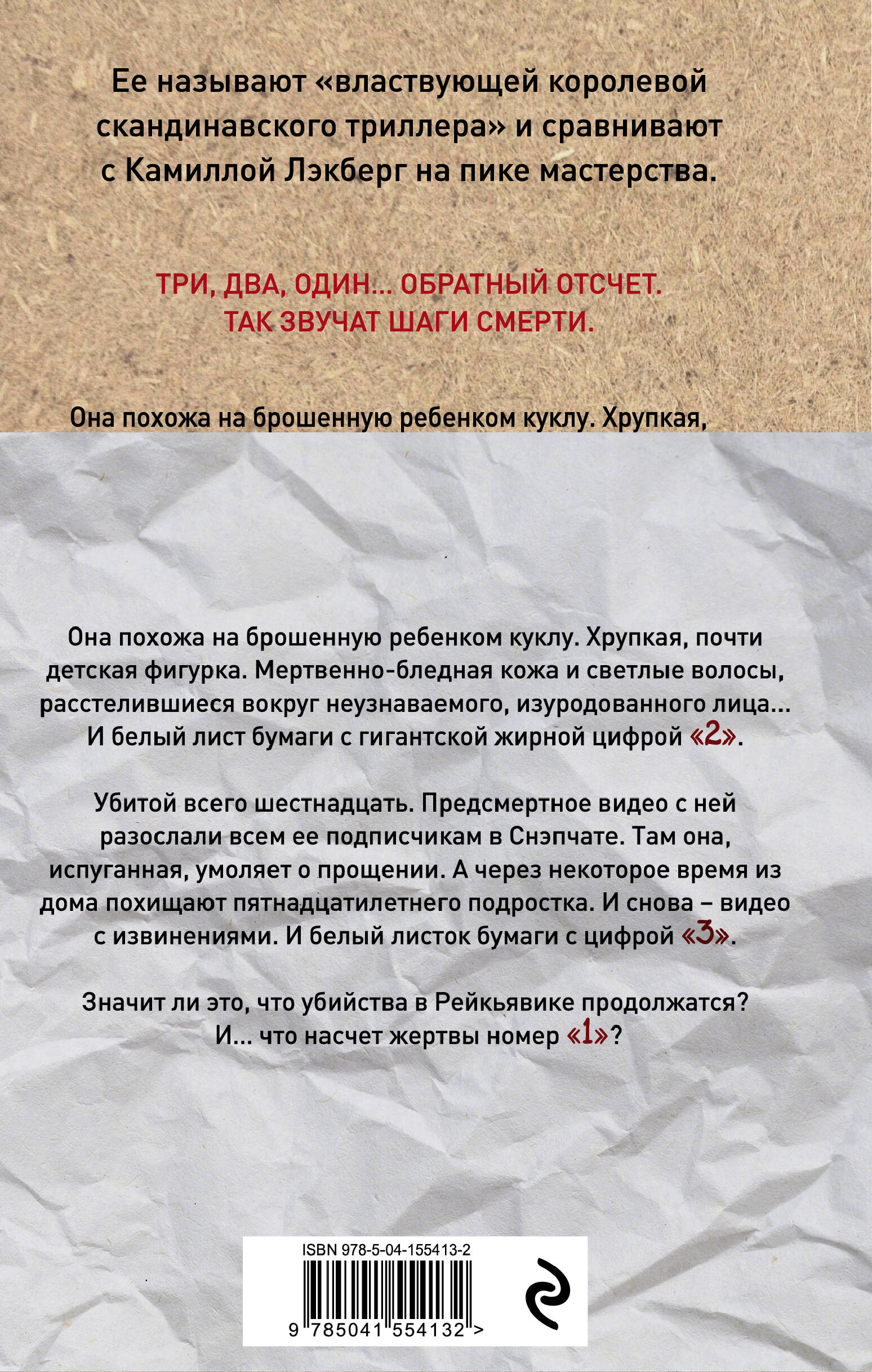 МЕЖДУНАРОДНЫЙ БЕСТСЕЛЛЕР ИЗ ИСЛАНДИИ. РОМАН ПЕРЕВЕДЕН БОЛЕЕ ЧЕМ НА 30 ЯЗЫКОВ МИРА. Самый ожидаемый криминальный роман 2020 года по версии Crimereads от королевы нуара из Исландии. ТРИ, ДВА, ОДИН… ОБРАТНЫЙ ОТСЧЕТ. ТАК ЗВУЧАТ ШАГИ СМЕРТИ. Она похожа на брошенную ребенком куклу. Хрупкая, почти детская фигурка. Мертвенно-бледная кожа и светлые волосы, расстелившиеся вокруг неузнаваемого, изуродованного лица... И белый лист бумаги с гигантской, жирной цифрой «2». Убитой всего шестнадцать. Предсмертное видео с ней разослали всем ее подписчикам в Снэпчате. Там она, испуганная, умоляет о прощении. А через некоторое время из дома похищают пятнадцатилетнего подростка. И снова - видео с извинениями. И белый листок бумаги с цифрой «3». Значит ли это, что убийства в Рейкьявике продолжатся? И… что насчет жертвы номер «1»? Мрачная, душераздирающая история о темной стороне человеческой природы и цене, которую порой приходится платить за то, что кажется безобидными шутками. «Блестяще… Эта душераздирающая история заслуживает широкой аудитории». - Publisher's Weekly «Сигурдардоттир мастерски сочетает сложные социальные проблемы и процедурные детали, делающие сюжет невероятно человечным. Своевременное поднятие планки в прекрасной серии». - Booklist «Выдающаяся писательница криминальных романов из Исландии». - Daily Express «Великолепная писательница». - Карин Слотер «Бесспорная королева Исландского Нуара». - Саймон Керник «Верьте ажиотажу - это преступление в лучшем виде». - Heat «Ирса остается королевой исландских триллеров». - The Guardian| Издательство | ООО "Издательство "Эксмо" |