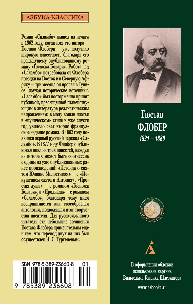 Роман «Саламбо» вышел из печати в 1862 году, когда имя его автора - Гюстава Флобера - уже получило широкую известность благодаря его предыдущему опубликованному роману «Госпожа Бовари». Работа над «Саламбо» потребовала от Флобера поездки на Восток и в Северную Африку - три месяца он провел в Тунисе, изучая исторические источники. «Саламбо» был восторженно принят публикой, пресыщенной главенствующим в литературе реалистическим направлением: в моду вошли платья в «пуническом» стиле, и уже спустя год увидело свет второе французское издание романа. В 1862 году появился первый русский перевод «Саламбо». В 1877 году Флобер опубликовал цикл из трех повестей, каждая из которых может быть соотнесена с одним из уже опубликованных ранее произведений: «Легенда о святом Юлиане Милостивом» - с «Искушением святого Антония», «Простая душа» - с романом «Госпожа Бовари», а «Иродиада» - с романом «Саламбо», благодаря чему цикл воспринимается как своеобразная антология, подводящая итог творчества писателя. Для русскоязычного читателя эти небольшие сочинения Гюстава Флобера примечательны еще и тем, что перевод двух из них был осуществлен И. С. Тургеневым.| Издательство | Азбука |