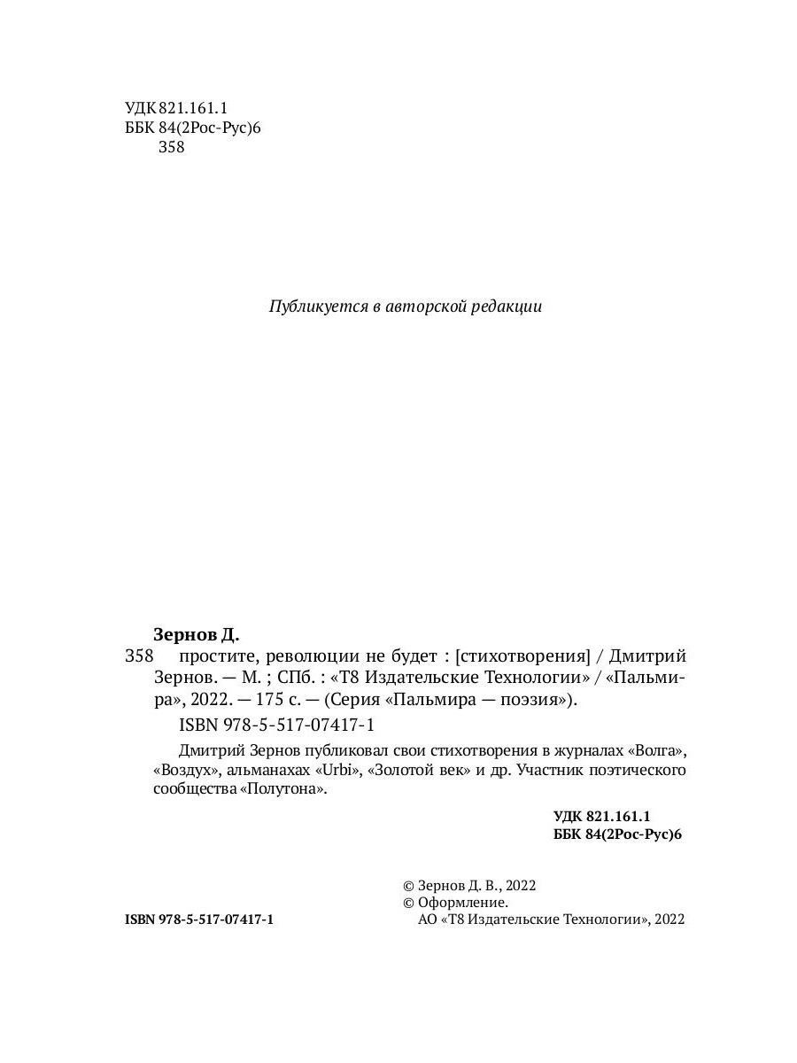 Дмитрий Зернов публиковал свои стихотворения в журналах «Волга», «Воздух», альманахах «Urbi», «Золотой век» и др. Участник поэтического сообщества «Полутона».| Издательство | Т8 RUGRAM |