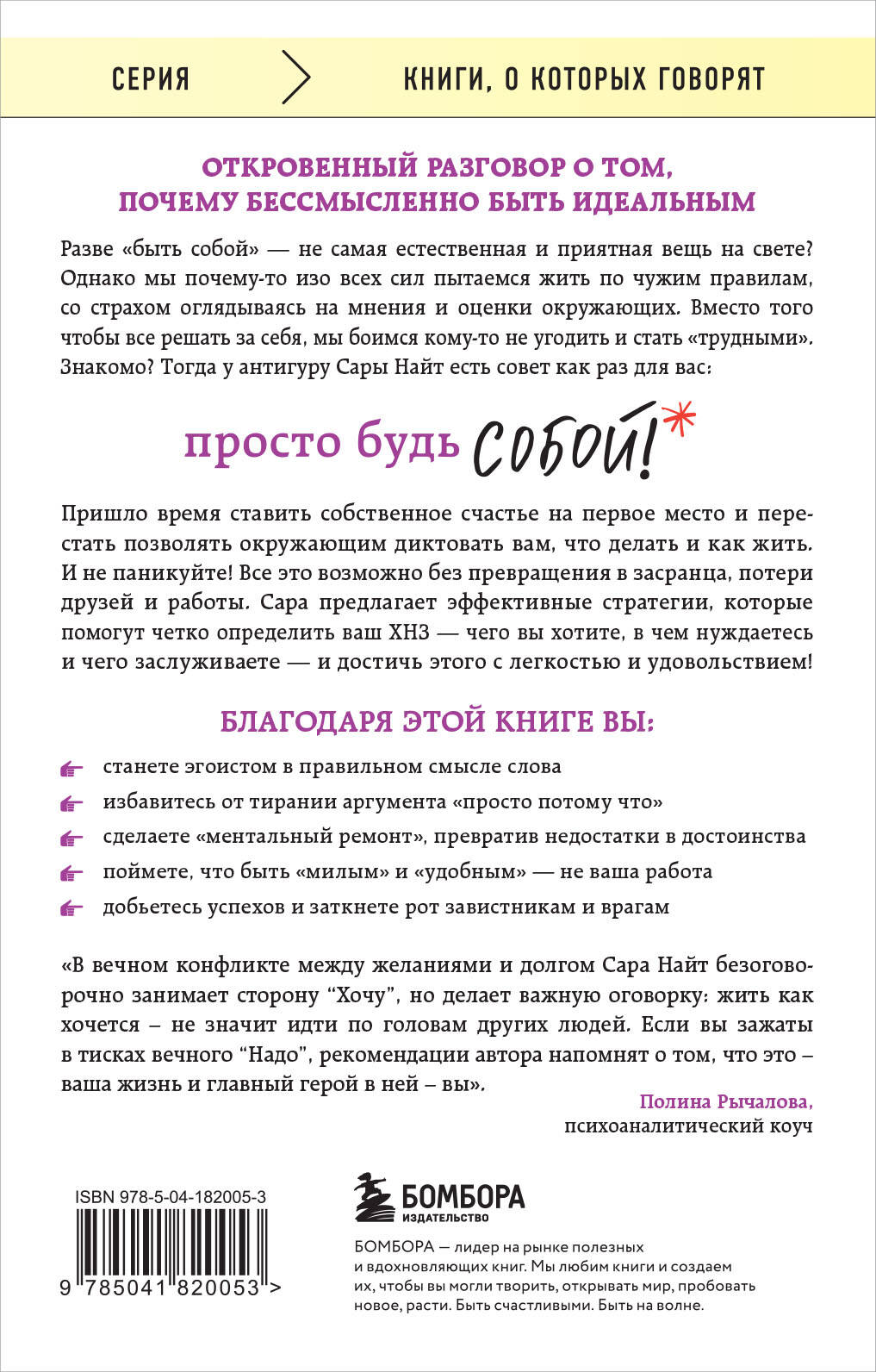Разве «быть собой» - не самая естественная и приятная вещь на свете? Однако мы почему-то изо всех сил пытаемся жить по чужим правилам, со страхом оглядываясь на мнения и оценки окружающих. Вместо того, чтобы все решать за себя, мы боимся кому-то не угодить и стать «трудными». Знакомо? Тогда у антигуру Сары Найт, автора бестселлеров «Магический пофигизм» и «Just f*cking do it» есть совет как раз для вас: «Просто будьте собой!» Пришло время ставить собственное счастье на первое место и перестать позволять окружающим диктовать вам, что делать и как жить. И не паникуйте! Всё это возможно без превращения в засранца, потери друзей и работы. Сара предлагает эффективные стратегии, которые помогут четко определить ваш ХНЗ - чего вы хотите, в чем нуждаетесь и чего заслуживаете, - и достичь этого с легкостью и удовольствием! Благодаря этой книге вы: - станете эгоистом в правильном смысле слова; - избавитесь от тирании аргумента «просто потому что»; - сделаете «ментальный ремонт», превратив недостатки в достоинства; - поймете, что быть «милым» и «удобным» - не ваша работа; - добьетесь успехов и заткнете рот завистникам и врагам.| Издательство | ООО "Издательство "Эксмо" |
