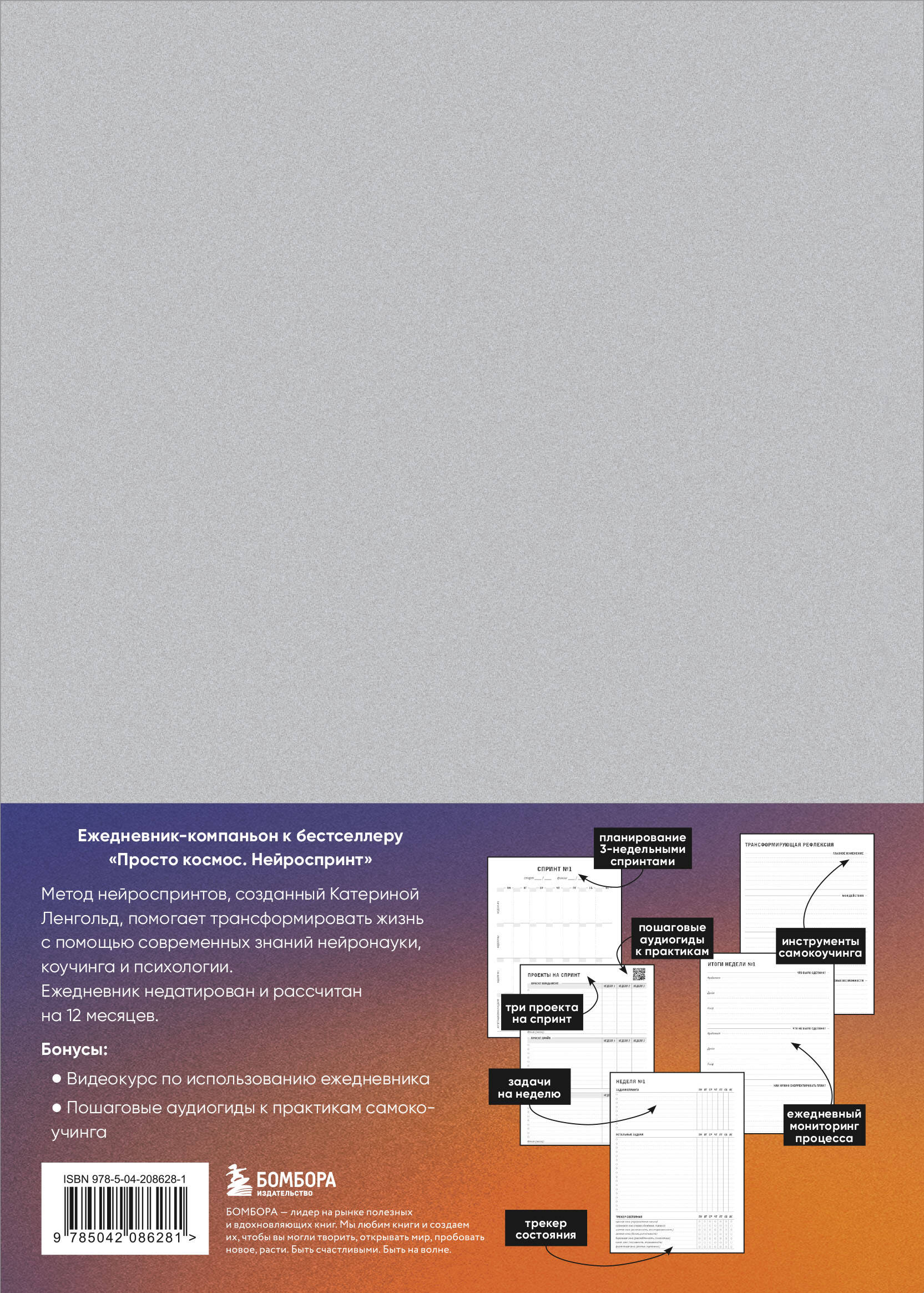 Ежедневник-компаньон к бестселлеру «Просто космос. Нейроспринт». В основе этого ежедневника лежит метод нейроспринтов, созданный Катериной Ленгольд (основатель Neurointegration Institute, США). В 23 года Катерина продала свой стартап и стала самым молодым руководителем в мировой аэрокосмический индустрии. В 2016 году, пережив тяжелое выгорание, она сместила фокус с запуска спутников к изучению человеческого мозга. Катерина создала нейроспринты - авторский алгоритм системной трансформации жизни, основанный на современных знаниях из нейронауки, коучинга и психологии. Благодаря методу нейроспринтов вы: - превратите мечты в реальные проекты и будете двигаться к ним без насилия над собой, не распыляя усилия - прекратите самосаботаж, «хождение кругами» и бесконечное ожидание идеального момента - научитесь управлять стрессом, сохранять оптимизм, спокойствие и удовольствие от жизни, даже в условиях непредсказуемости. Это эффективная и научно обоснованная система, которую каждый может встроить в свою жизнь, уделяя всего 30 часов в месяц. Бонусы: 1. Курс из пяти видеоуроков с подробным рассказом, как пользоваться ежедневником. 2. Пошаговые аудиогиды к ежедневным, еженедельным и ежемесячным практикам для мониторинга прогресса и самокоучинга. В оформлении ежедневника используется резинка, 2 ленты-ляссе.| Издательство | ООО "Издательство "Эксмо" |