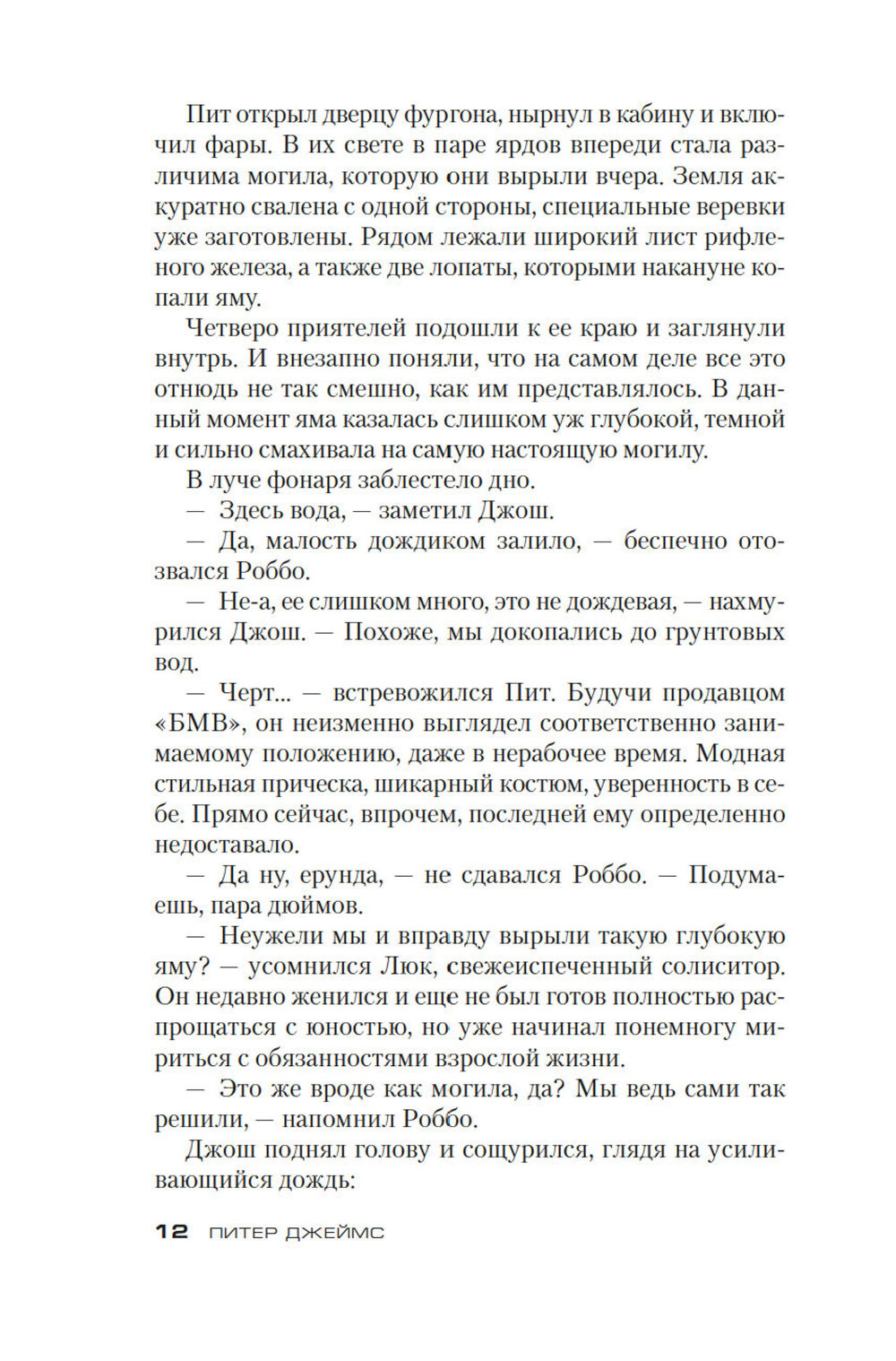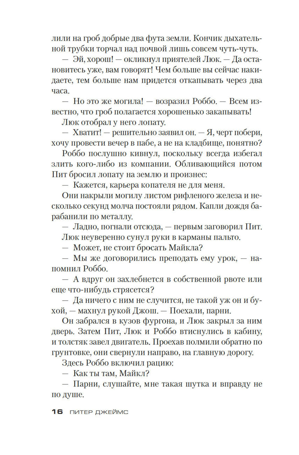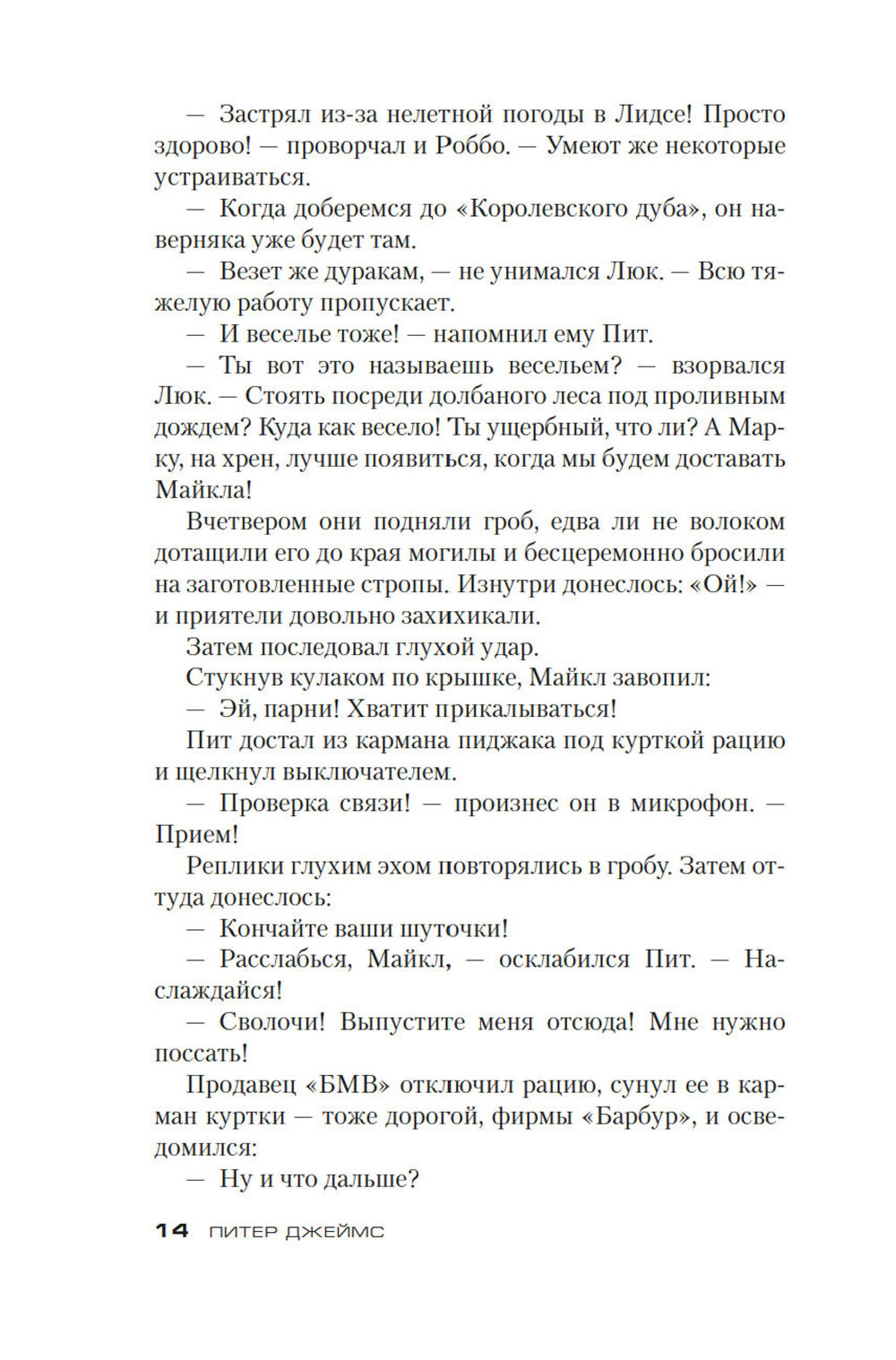 Некоторые шутки обходятся слишком дорого, и последствия могут быть непредсказуемы... Удачливый молодой бизнесмен Майкл Харрисон накануне свадьбы пригласил четырех закадычных друзей на мальчишник, намереваясь на славу повеселиться. Он и не подозревает, что товарищи решили отомстить счастливому жениху за все его многочисленные приколы и задумали необычный розыгрыш: Майклу предстоит провести несколько часов в гробу, закопанном в землю. Возможно, он и оценил бы эту шутку по достоинству, если бы судьба не внесла свои коррективы: буквально через несколько минут приятели погибают. Теперь Харрисон обречен, ведь никто не знает, где его искать. Или шанс все-таки есть? Суперинтендант Рой Грейс, к которому попадает дело о загадочном исчезновении, намерен сделать все возможное и невозможное, ибо не понаслышке знает, как это ужасно, когда люди пропадают без вести. Ведь его жена Сэнди девять лет назад тоже ушла из дому и не вернулась... Роман выходит в новом переводе. В 2021 году на ITV стартовал британский сериал «Грейс», снятый по мотивам бестселлеров Питера Джеймса (заявлено 5 сезонов, вышло уже 4). В главной роли - Джон Симм (теледетектив «Жизнь на Марсе», научно-фантастический телесериал Би-би-си «Доктор Кто»).| Издательство | Азбука |