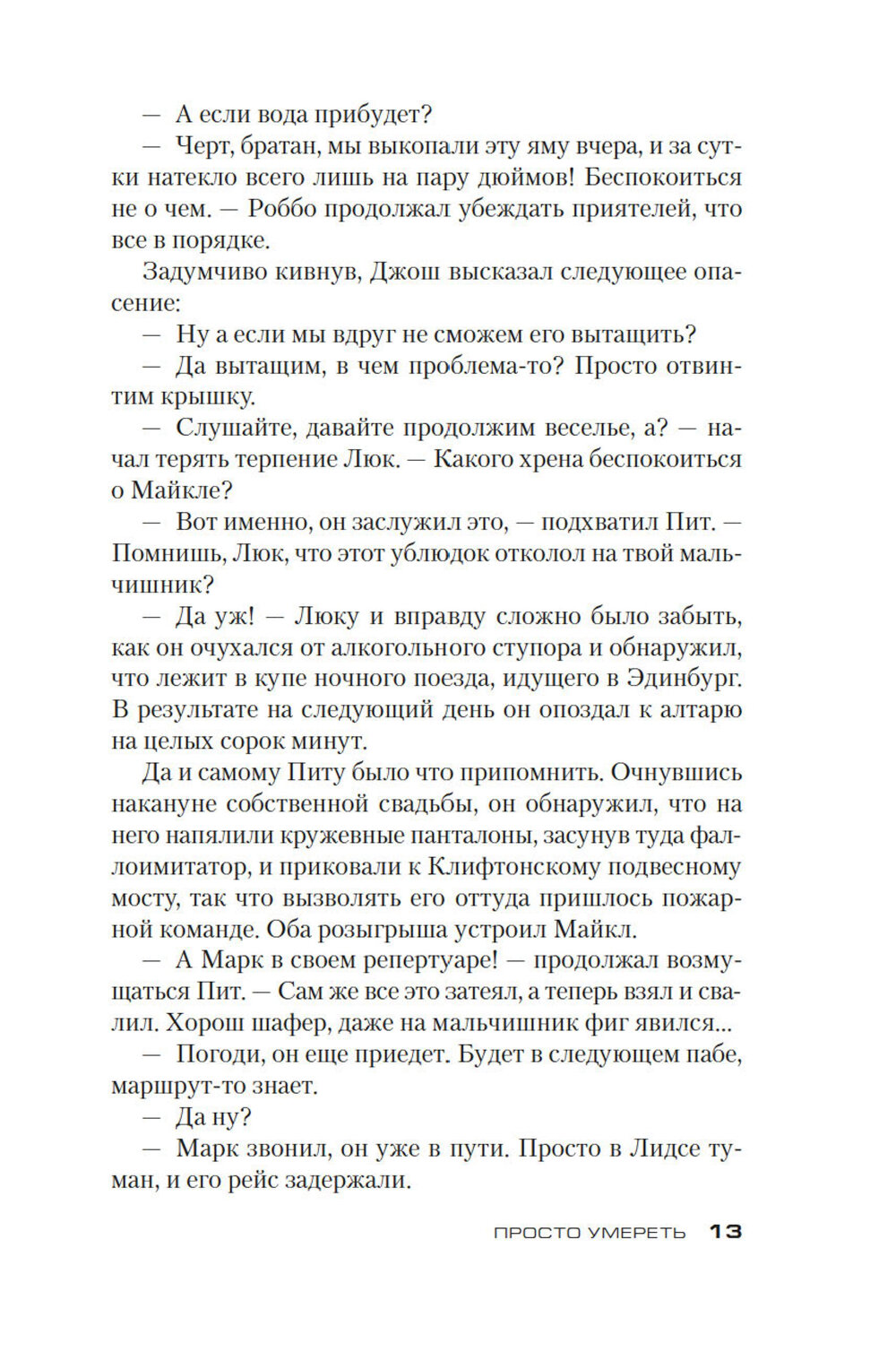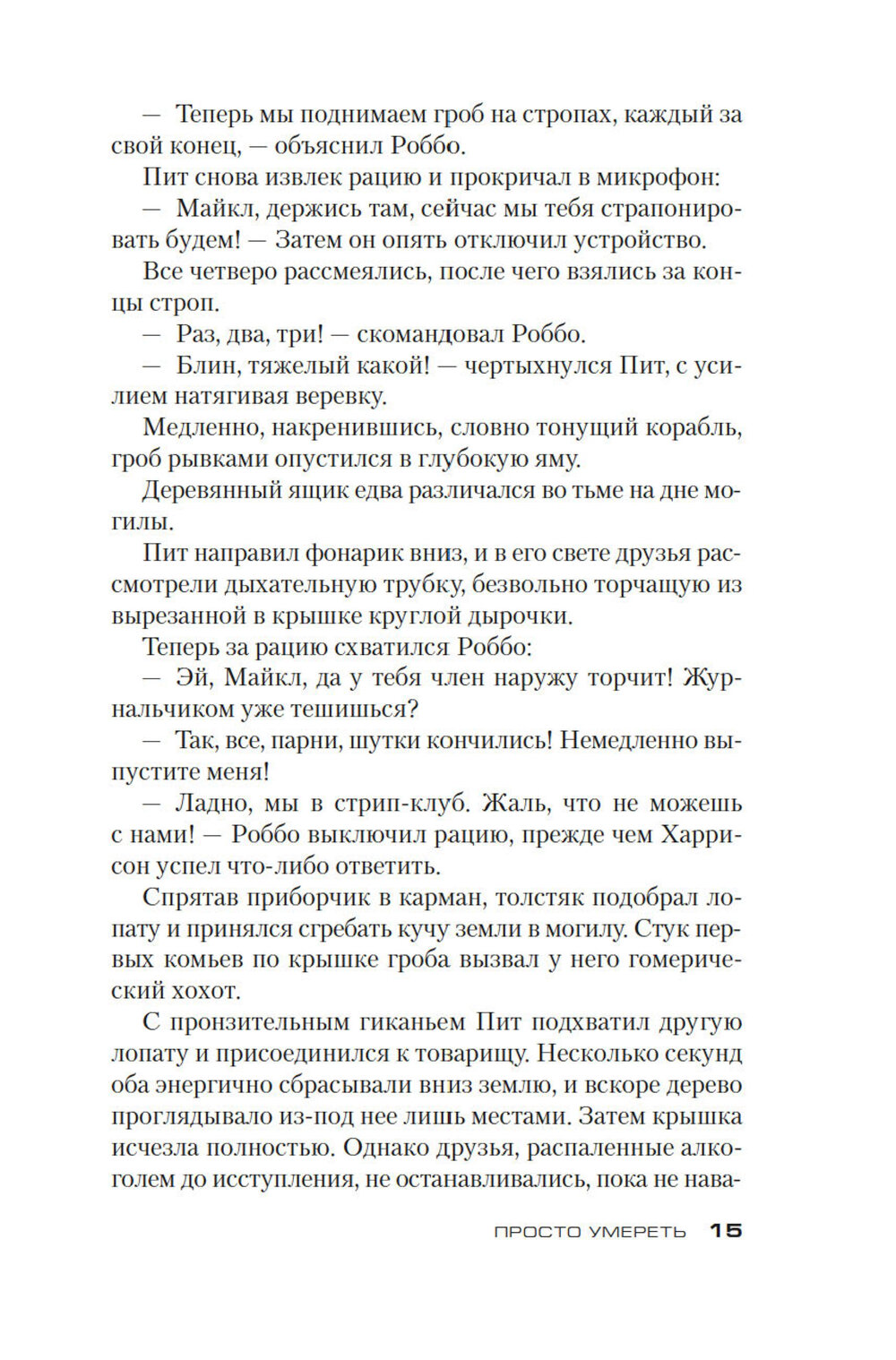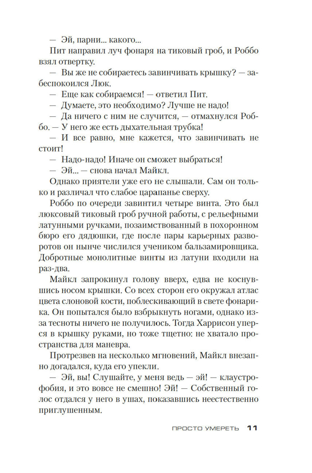Некоторые шутки обходятся слишком дорого, и последствия могут быть непредсказуемы... Удачливый молодой бизнесмен Майкл Харрисон накануне свадьбы пригласил четырех закадычных друзей на мальчишник, намереваясь на славу повеселиться. Он и не подозревает, что товарищи решили отомстить счастливому жениху за все его многочисленные приколы и задумали необычный розыгрыш: Майклу предстоит провести несколько часов в гробу, закопанном в землю. Возможно, он и оценил бы эту шутку по достоинству, если бы судьба не внесла свои коррективы: буквально через несколько минут приятели погибают. Теперь Харрисон обречен, ведь никто не знает, где его искать. Или шанс все-таки есть? Суперинтендант Рой Грейс, к которому попадает дело о загадочном исчезновении, намерен сделать все возможное и невозможное, ибо не понаслышке знает, как это ужасно, когда люди пропадают без вести. Ведь его жена Сэнди девять лет назад тоже ушла из дому и не вернулась... Роман выходит в новом переводе. В 2021 году на ITV стартовал британский сериал «Грейс», снятый по мотивам бестселлеров Питера Джеймса (заявлено 5 сезонов, вышло уже 4). В главной роли - Джон Симм (теледетектив «Жизнь на Марсе», научно-фантастический телесериал Би-би-си «Доктор Кто»).| Издательство | Азбука |