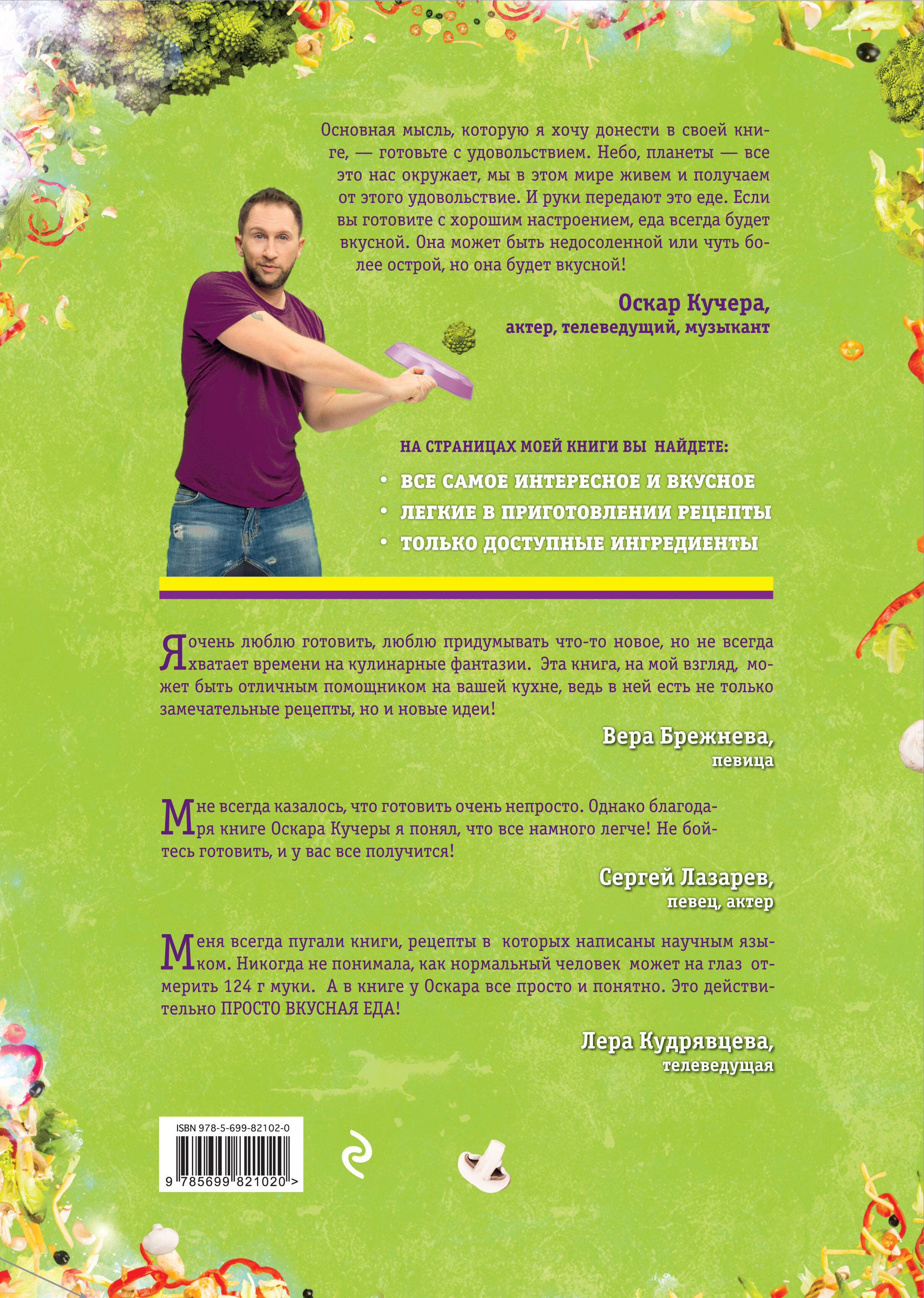 "С детства увлекаюсь приготовлением пищи, очень люблю это дело, и могу, наверное, назвать себя в каком-то смысле гурманом. Люблю готовить, люблю и поесть. Люблю заходить в рестораны и общаться с поварами. И в силу того, что мне повезло довольно долго работать на «Кулинарном поединке» и пообщаться с огромным количеством поваров, не поделиться свои опытом было бы с моей стороны просто глупо. Я не пытался в этой книге писать какие-то новые и необыкновенные рецепты, просто это попытка собрать воедино все интересное и вкусное из моего общения с поварами, представить самые приятные и легкие в приготовлении блюда и поделиться их рецептами с читателями. Основная мысль, которую я хочу донести в своей книге, - готовьте с удовольствием. Небо, планеты - всё это нас окружает, мы в этом мире живём и получаем от этого удовольствие. И руки передают это еде. Если вы готовите с хорошим настроением, еда всегда будет вкусной. Она может быть недосоленной или чуть более острой, но она будет вкусной". Оскар Кучера| Издательство | ООО "Издательство "Эксмо" |