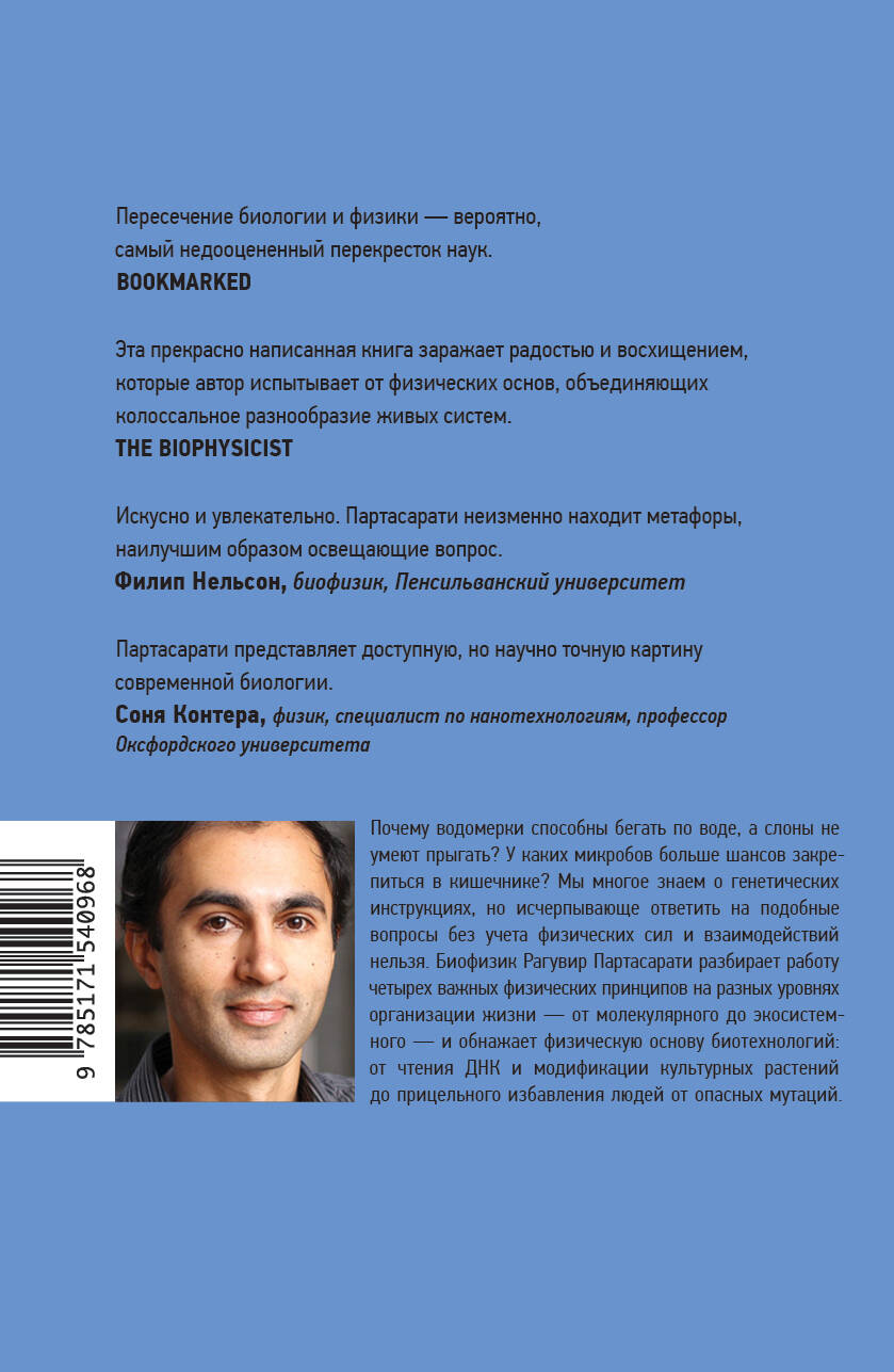 Биофизик Рагувир Партасарати объясняет, как четыре физических принципа - самосборка, регуляторные схемы, предсказуемая случайность и масштабирование - определяют структуру и поведение биологических систем, от укладки молекул белка и активности генов до судьбы бактерий в кишечном сообществе. Эти закономерности лежат в основе всего многообразия живой природы и позволяют развивать немыслимые прежде биотехнологии. Действие физических правил автор разбирает на массе примеров, включая упаковку вирусной ДНК, устройство мембран, закладку плана тела в эмбриогенезе, органы на чипе, редактирование генома, прионные болезни и муковисцидоз.| Издательство | Издательство "АСТ" |