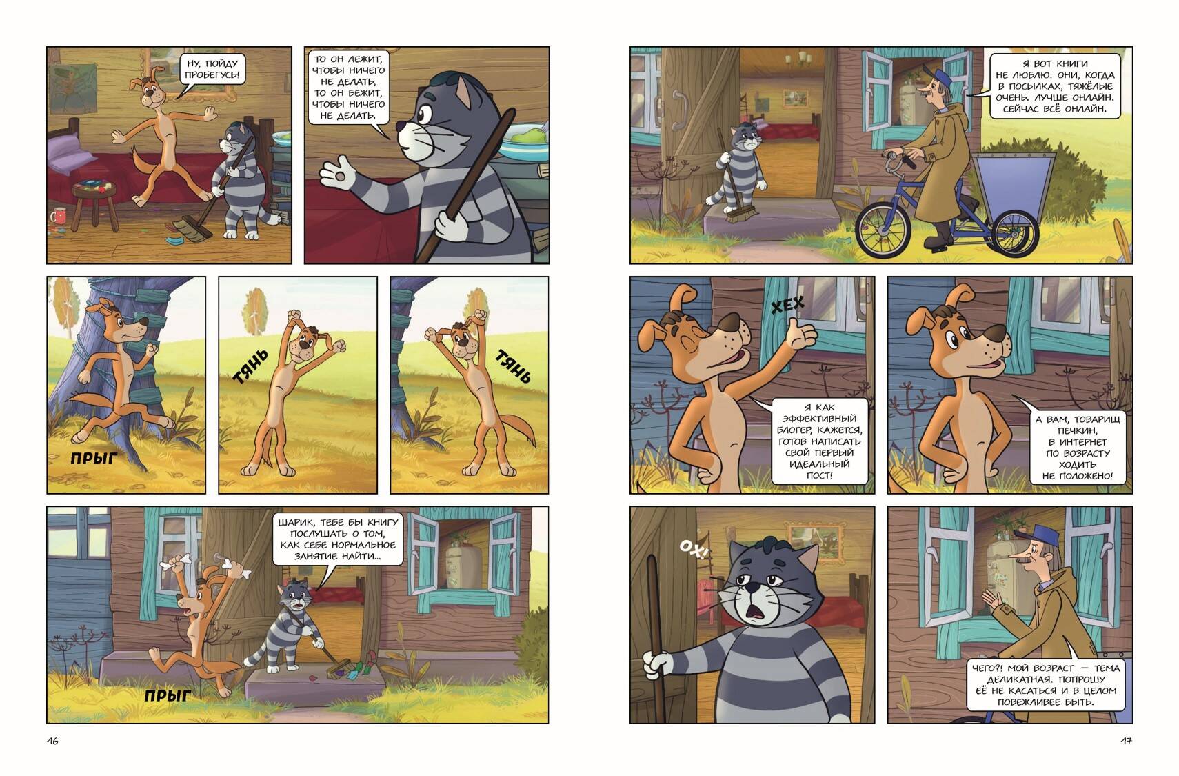 У Шарика много увлечений. Он интересуется экологией. Ведёт свой блог: пишет посты о лесных зверях, снимает видео, спорит с комментаторами. Но больше всего Шарик любит отдыхать: лежать на печи, ходить на рыбалку с Бобром и отмечать праздники. Ему приходится проявлять недюжинную смекалку, ведь с Матроскиным не так-то просто отлынивать от работы. 5 забавных историй из жизни неисправимого оптимиста Шарика! Новое «Простоквашино» теперь и в формате комикса! Книга в твёрдом переплёте, с яркими мелованными страницами и крупным шрифтом станет отличным подарком для всех фанатов культовых мультфильмов!