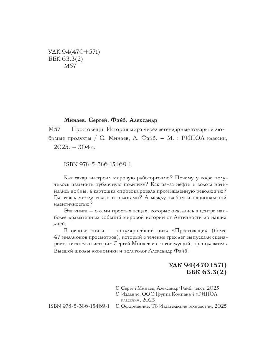 Как сахар выстроил мировую работорговлю? Почему у кофе получилось изменить публичную политику? Как из-за нефти и золота начинались войны, а картошка спровоцировала промышленную революцию? Где связь между солью и налогами? А между хлебом и национальной идентичностью? Эта книга - о семи простых вещах, которые оказались в центре наиболее драматичных событий мировой истории от Античности до наших дней. В основе книги - популярнейший цикл «Простовещи» (более 47 миллионов просмотров), который в течение трех лет выпускали сценарист, писатель и историк Сергей Минаев и его соведущий, преподаватель Высшей школы экономики и политолог Александр Файб.| Издательство | Рипол Классик |