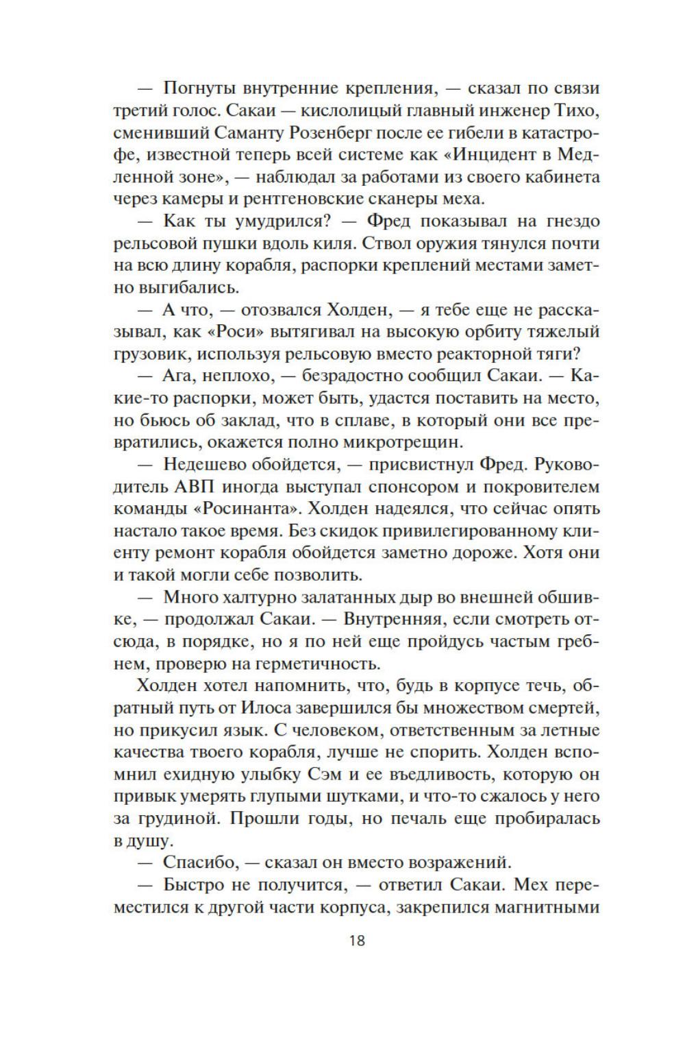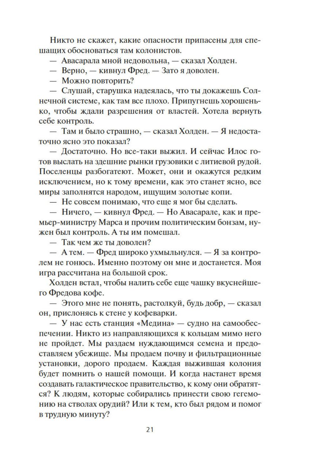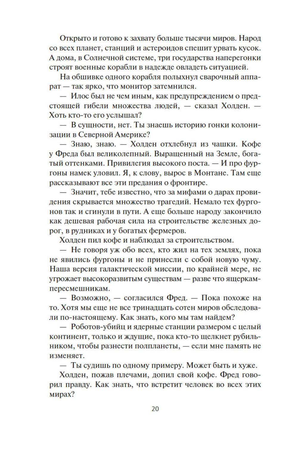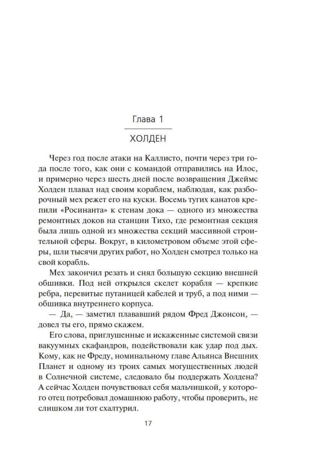 СОДЕРЖИТ ИНФОРМАЦИЮ О НАРКОТИЧЕСКИХ ИЛИ ПСИХОТРОПНЫХ ВЕЩЕСТВАХ, УПОТРЕБЛЕНИЕ КОТОРЫХ ОПАСНО ДЛЯ ЗДОРОВЬЯ. ИХ НЕЗАКОННЫЙ ОБОРОТ ВЛЕЧЕТ УГОЛОВНУЮ ОТВЕТСТВЕННОСТЬ. Пути к тысячам миров внезапно открылись перед человечеством, и началась охота за колониями, какой еще не бывало в его истории. Волна за волной переселенцы отправляются в космос, а тем временем на их родине, в Солнечной системе, катастрофически слабеет государственная власть. Бесследно исчезают корабли. Тайно формируются частные армии. Выкраден последний образец протомолекулы. Террористы своими акциями добиваются того, о чем прежде и мечтать не смели, - подчинения внутренних планет. Пришла расплата за старые грехи, и цена их чудовищна. А пока в огне и крови рождается новый порядок, Джеймс Холден и экипаж «Росинанта» вынуждены бороться, чтобы выжить и вернуться домой.| Издательство | Азбука |