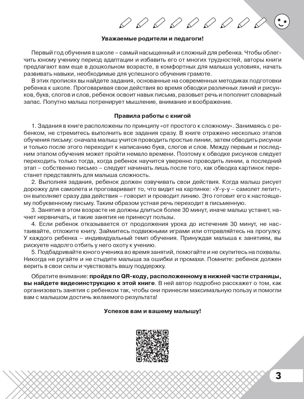 Лучшие логопеды-практики для ваших детей! Первый год обучения в школе - самый насыщенный и сложный для ребенка. Чтобы избавить юного ученика от многих трудностей, необходимо начинать занятия еще в дошкольном возрасте, в комфортных для малыша условиях. Заботливые взрослые именно так и поступают. Умение правильно держать ручку или карандаш, ориентироваться на листе бумаги - важнейший навык для дошкольника. Среди множества прописей эта книга выделяется тем, что все задания многократно опробованы на занятиях логопедов с детьми. К тому же ребенок будет не просто рисовать линии, обводить рисунки, буквы, слоги и слова, но попутно проговаривать свои действия, что является отличным способом развития речи. А чтобы правильно организовать занятия, сделать их по-настоящему полезными обязательно посмотрите ВИДЕО-РУКОВОДСТВО, записанное автором Олесей Жуковой. Для этого надо всего лишь отсканировать QR-код, расположенный в книге.