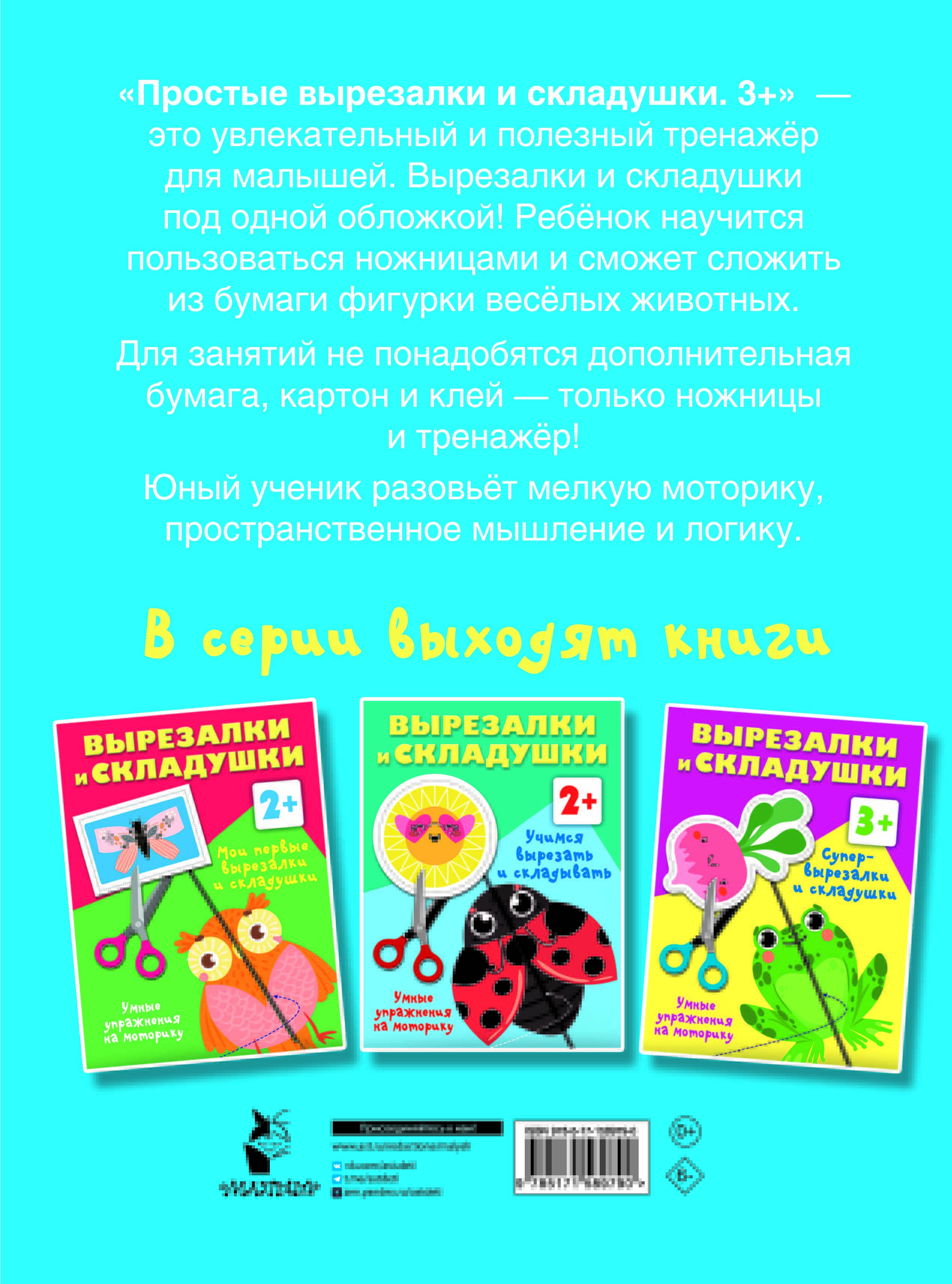 Как помочь ребёнку развить пространственное мышление, мелкую моторику и логику? На помощь юным ученикам и родителям приходит книга «Простые вырезалки и складушки. 3+». Это увлекательный и полезный тренажёр для малышей. Ребёнок сможет вырезать красочные изображения предметов и складывать из бумаги весёлых животных. Для занятий не понадобится дополнительная бумага, картон и клей - только ножницы и тренажёр! Вырезалки развивают у детей мелкую моторику и аккуратность. Малыш учится воспринимать цвета, формы, текстуры предметов, их положение относительно друг друга. Складывая лист, юный ученик совершает скоординированные движения: придерживает лист, загибает его, проглаживает по линии сгиба. Такие занятия развивают мелкую моторику, пространственное мышление, логику, внимание, самоконтроль и аккуратность. Здесь нет никаких скучных заданий - только веселье, игра и творчество!| Издательство | ИЗДАТЕЛЬСТВО "АСТ" |