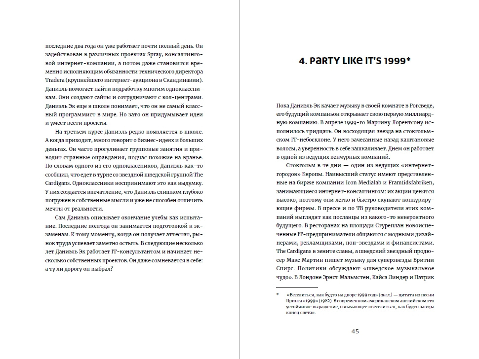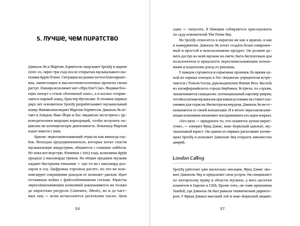 <div class="b-post-content _bookPage"><h2 id="o-chem">О чем</h2><p>За несколько лет компания Spotify буквально трансформировала музыкальную индустрию: спасла звукозаписывающие корпорации от пиратов, заставила содрогнуться Apple и эффектно появилась на Уолл-стрит. А в 2020 году она запустила свой сервис и в России. Еще ни одной шведской компании не удавалось завоевать такой авторитет в мировой поп-культуре. </p><p>Авторы этой книги Свен Карлcсон и Юнас Лейонхуфвуд провели свое журналистское расследование, поговорили с участниками этой бизнес-трансформации, среди которых люди из руководства Spotify, инвесторы, авторитетные деятели музыкальной индустрии и конкуренты компании. </p><p>Вы узнаете, как неразговорчивый гик Даниэль Эк и его богатый компаньон Мартин Лорентсон вели переговоры с финансистами и набирали команду выдающихся разработчиков. Вы проследите за судьбами героев и узнаете, как Spotify, крупнейшая IT-компания Европы, появившись на свет в 2006 году, уже к началу 2019-го была стриминговым сервисом номер один в мире, и почему генеральный директор и сооснователь Даниэль Эк считает, что они еще только в начале пути.</p><p><br></br></p><div class="box _cite"><div class="i-cite"><p class="i-cite__text"> «К концу 2010 года для Стива Джобса нет ничего важнее конкуренции между iPhone и Android. Он считает мощный музыкальный потенциал Apple оружием в «священной войне» против мобильных систем Google. Загрузки - скачиваемые файлы, которые продаются поштучно, - это его метод прибрать к рукам музыку, не пуская ее в мир Android. А Даниэль Эк решит действовать наоборот… и выиграет. Spotify предлагает музыкальный стриминг на всех платформах - быстро и даже бесплатно для тех, кто готов терпеть рекламу. Стив Джобс понимает: это сильно. Что, если шведы получат лицензию в США, а потом их возьмет да и купит Google?» </p></div></div><h2 id="dlya-kogo">Для кого</h2><p>Книга будет интересна представителям IT-индустрии, музыкального бизнеса, предпринимателям и тем, кто любит музыку.</p><div class="box _cite"><div class="i-cite"><p class="i-cite__text"> «Хорошо, что эти ребята в Барселоне понятия не имеют, как им будет сложно. Знали бы - возможно, и не стали бы браться. От одного слова «бесплатно» директора звукозаписывающих фирм будут закатывать глаза и качать головами. У основателей новой компании нет никакого опыта в переговорах о лицензионных правах. Они даже не представляют, какой единодушный отпор дадут им противники, когда речь зайдет о цифровой дистрибуции вообще и пиринговых технологиях в частности. Однако и сильных сторон у барселонской банды целых три. Первая - опыт и деньги Мартина Лорентсона. Второй - чутье Даниэля Эка (это касается будущего продукта). И третий - способность Андреаса Эна привлечь к работе лучших специалистов Швеции». </p></div></div><div class="i-cut"><div class="i-cut__inner"><h2 id="otzyvy-ekspertov">Отзывы экспертов</h2></div><div class="i-cut__action"><a class="i-cut__activator link-txt _caps-14 _gray _t-bold" data-cut-text-active="Свернуть" data-cut-text-default="Развернуть" href="#">Развернуть</a></div></div></div>| Издательство | Альпина |
