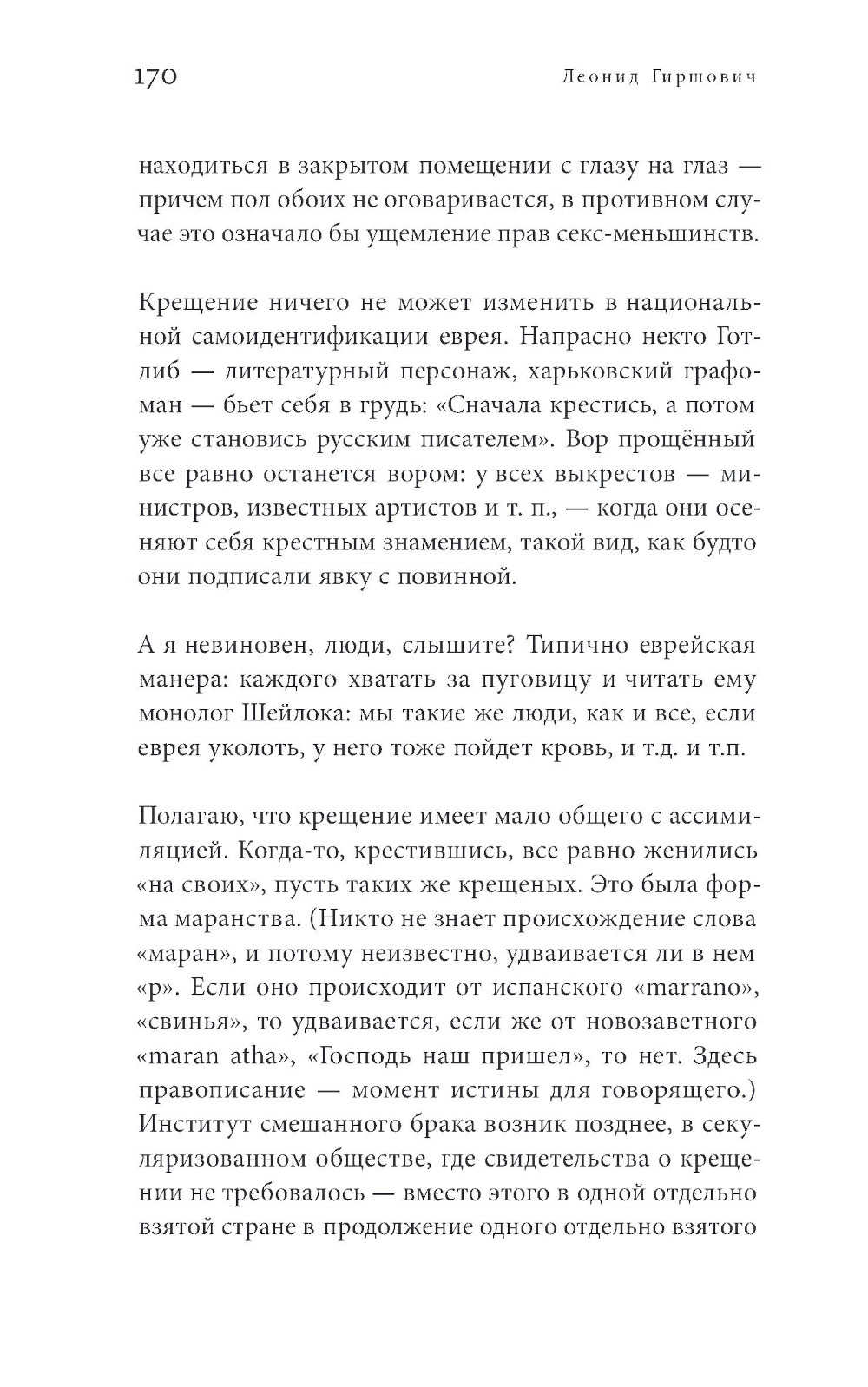 Что значит обрести свою идентичность не по факту рождения, а в процессе долгой и непростой культурной эволюции? Что значит всегда быть «другим» - для общества, для культуры, для самого себя, наконец? В новой книге Леонида Гиршовича произведения разных жанров объединены темой еврейства - от карнавального обыгрывания сюжета Рождества в повести «Радуйся» до эссе об антисемитизме, процессах над нацистскими преступниками и о том, следует ли наказывать злодеев во имя справедливости. На страницах книги появляются святые и грешники, гонимые и гонители, гении и ничтожества, палачи и жертвы - каждый из них обретает в прозе и эссеистике автора языковую и человеческую индивидуальность. Леонид Гиршович - писатель и музыкант, автор романов и повестей «Обмененные головы» (1992), «Прайс» (1998), «Вий. Вокальный цикл Шуберта на слова Гоголя» (2005), «Фашизм и наоборот» (2006), «Шаутбенахт» (2006).| Издательство | Новое литературное обозрение |