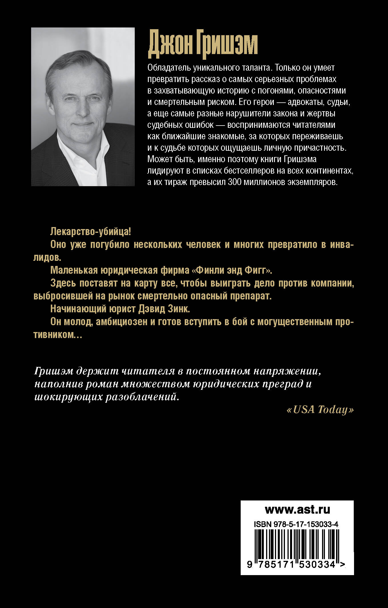 Лекарство-убийца! Оно уже погубило нескольких человек и многих превратило в инвалидов. Маленькая юридическая фирма "Финли энд Фигг". Здесь поставят на карту все, чтобы выиграть дело против компании, выбросившей на рынок смертельно опасный препарат. Начинающий юрист Дэвид Зинк. Он молод, амбициозен и готов вступить в бой с могущественным противником…| Издательство | ИЗДАТЕЛЬСТВО "АСТ" |