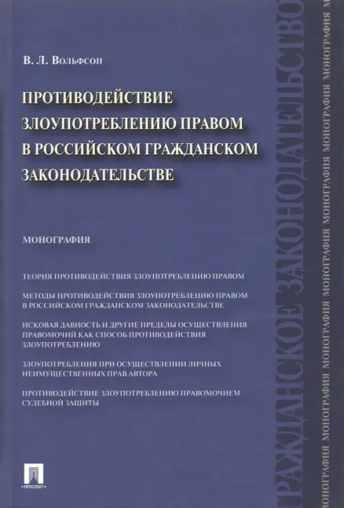 Предметом монографии В.Л.Вольфсона является злоупотребление правом - малоизученная и остро нуждающаяся в изучении доктрина цивилистики. В монографии исследуются сложные отношения между субъективным правом и интересом, а также между "вмененным" и "подлинным" интересом. Критерием злоупотребления правовым благом является несоответствие меры удовлетворения подлинного интереса уровню удовлетворения, которое обеспечивается данным благом. В.Л.Вольфсон исследует также систему противодействия злоупотреблению правом в российском законодательстве выделяет отдельные методы противодействия, на модельных примерах показывает работоспособность его теории злоупотребления. Одной из таких моделей в работе становится раскрытое в терминах предлагаемой теории право на иск.Самостоятельный раздел работы посвящен изучению правотворчества римского претора и возможности заимствования некоторых принципов этого правотворчества в современных стратегиях противодействия злоупотреблению правом.