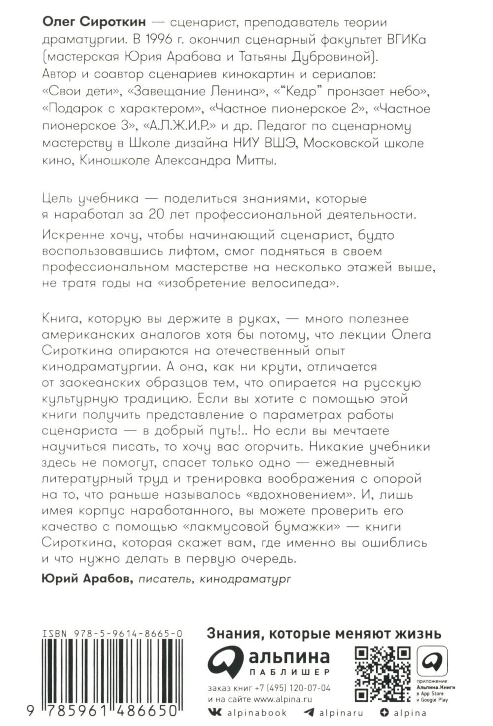 Секрет зрительского успеха кинокартины кроется в трех словах: противоречие, перевертыш, парадокс. «Положите в основу сюжета парадокс. Противоречие пусть станет неотъемлемой чертой характера персонажа. Перевертыш - одним из способов художественно решить сцену…» - говорит сценарист и преподаватель теории драматургии Олег Сироткин. В своей книге он приводит наглядные примеры, как реализуются эти приемы в кино, и помогает авторам в работе над сценарием - от идеи до первого драфта. Через разбор культового фильма «Матрица» Олег Сироткин дает понятную и простую схему сценарной структуры фильма. Он также рассказывает о специфике работы отечественных сценаристов и анализирует особенности сценариев для кинокартин различных жанров и форматов: от полнометражных фильмов до ультракоротких веб-сериалов. Эта книга- практическое руководство для начинающих сценаристов, а также писателей, которые хотят попробовать свои силы в сценарном мастерстве.| Издательство | Альпина Паблишер |