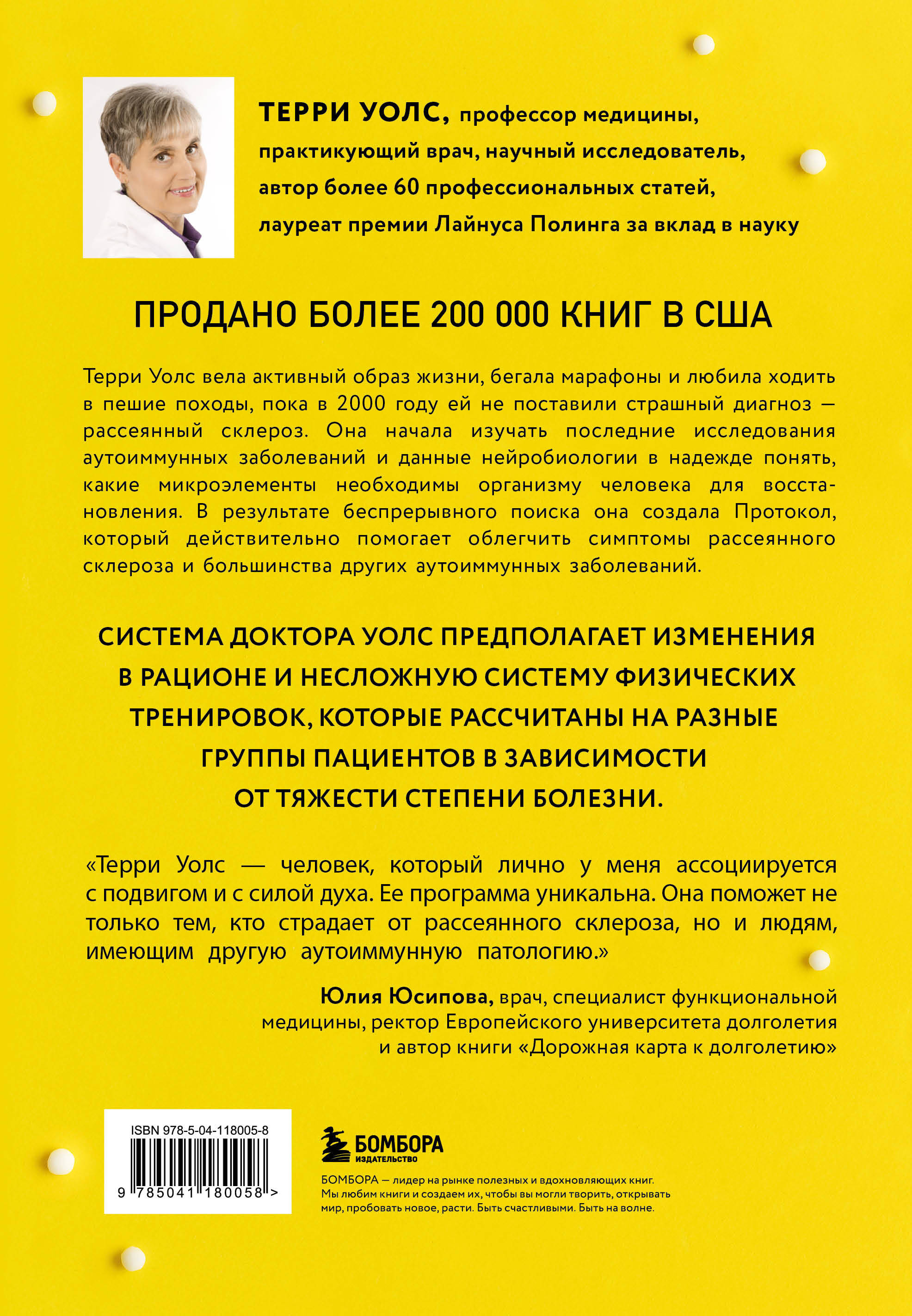 Терри Уолс вела активный образ жизни, бегала марафоны и любила ходить в пешие походы, пока в 2000 году ей не поставили страшный диагноз - рассеянный склероз. Буквально за считанные месяцы она оказалась прикованной к инвалидному креслу, ее тело больше не слушалось ее, а карьера успешного врача шла под откос из-за потери концентрации и вечной усталости - спутников сложной болезни. Будучи настоящим исследователем, Терри Уолс решила не сдаваться и победить страшный диагноз во что бы то ни стало - с кропотливой дотошностью она изучала новейшие исследования и опыты на мышах, а также сутками читала научные статьи. В результате беспрерывного поиска она создала Протокол, который действительно помогает вылечить симптомы рассеянного склероза и большинства других аутоиммунных заболеваний. Система доктора Уолс предполагает изменения в рационе и несложную систему физических тренировок, которые рассчитаны на разные аудитории пациентов в зависимости от тяжести степени болезни. Удивительно вдохновляющая история врача, которая не перестала бороться и изобрела способ вернуть привычную жизнь себе и миллионам людей с тяжелым диагнозом, которые уже были готовы отчаяться и потерять надежду.| Издательство | ООО "Издательство "Эксмо" |