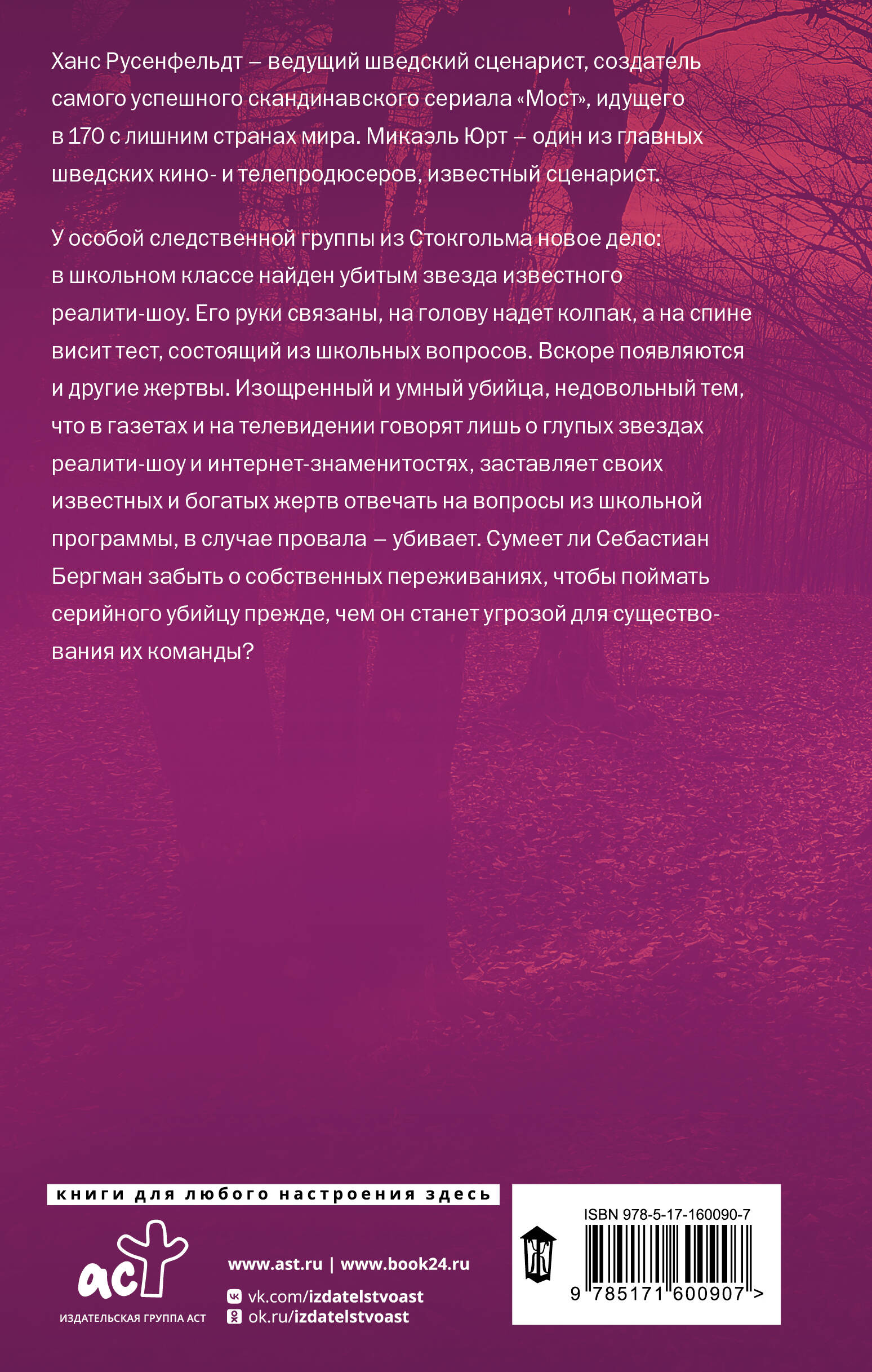 У особой следственной группы из Стокгольма новое дело: в школьном классе найден убитым звезда известного реалити-шоу. Его руки связаны, на голову надет колпак, а на спине висит тест, состоящий из школьных вопросов. Вскоре появляются и другие жертвы. Изощренный и умный убийца, недовольный тем, что в газетах и на телевидении говорят лишь о глупых звездах реалити-шоу и интернет-знаменитостях, заставляет своих известных и богатых жертв отвечать на вопросы из школьной программы, в случае провала - убивает. Сумеет ли Себастиан Бергман забыть о собственных переживаниях, чтобы поймать серийного убийцу прежде, чем он станет угрозой для существования их команды?| Издательство | Издательство "АСТ" |