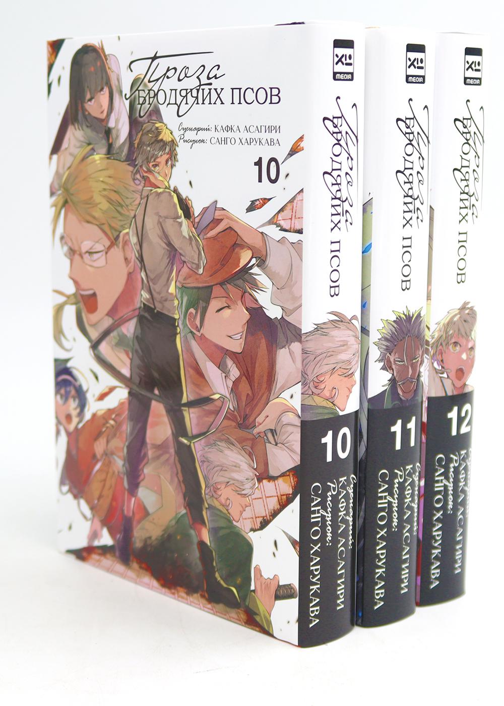 Комплект состоит из трех томов (10-12) манги Кафки Асагири «Проза бродячих псов». В десятом томе Камуй из «Падения ангела» задумал серию убийств: сотрудники Вооруженного детективного агентства должны исчезнуть один за другим. Однако кое-кто не намерен сдаваться, и только его усилиями агентство обязательно вернется к жизни. После самой темной ночи всегда наступает рассвет... Условный знак к возрождению уже подан! В одиннадцатом томе судьба всего мира и детективного агентства лежит на хрупких плечах Аи, убегающей от врагов с Брэмом на спине. Тем временем в «Мёрсо» неожиданно врывается Гоголь и предлагает Дадзаю и Достоевскому сыграть в игру на выживание, и награда тому - побег из тюрьмы. Дадзай вступает в состязание вместе с товарищем Гоголя Сигмой, но и у Достоевского появляется неожиданный сторонник... Агентство против «Гончих», Дадзай против Достоевского... Конфронтация привела к прямому столкновению! В двенадцатом томе смертельная игра Гоголя в самом разгаре, и Дадзаю нужно срочно организовать свой побег из тюрьмы. Его противник Достоевский находит себе помощника, и вскоре Дадзай и Сигма узнают в нем Тюю Накахару, которого обратили в вампира. Непримиримые соперники сталкиваются нос к носу, и Дадзай бросает Накахаре судьбоносную фразу... В то же время в аэропорту «Гончие» ожесточенно давят детективов: Тэттё Суэхиро против Кэндзи Миядзавы, Тэруко Окура против Ацуси Накадзимы... а Фукудзава вот-вот обменяется парочкой ударов с Фукути. Очень скоро все участники противостояния узнают, что сдать позиции невозможно. Что пробил час решить, кто выйдет из схватки победителем, а кто окончательно проиграет.| Издательство | ЭксЭл Медиа |