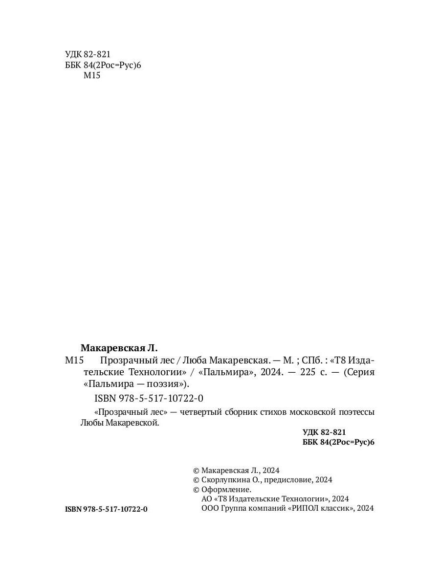 «Прозрачный лес» - четвертый сборник стихов московской поэтессы Любы Макаревской.| Издательство | Т8 RUGRAM |