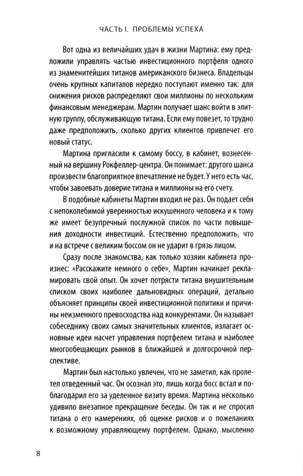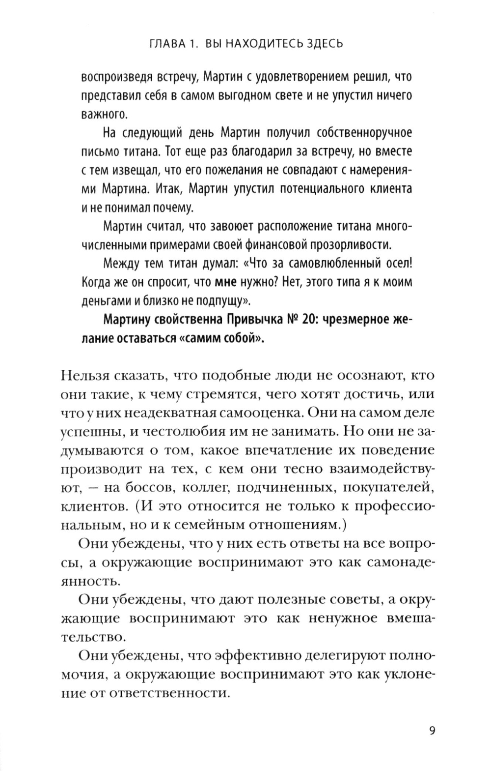 Книга Маршалла Голдсмита парадоксальна по своей сути. Она написана в помощь людям, которые... уже добились грандиозного успеха. У них есть все, к чему они стремились, сбылись все их мечты. Казалось бы, чего еще им желать? И вот тут-то и кроется парадокс. Вы достигли процветания и вправе гордиться собой. Но при этом нередко случается то, что Маршалл Голдсмит называет утратой «внутренней карты». Что это значит? Да то, что вы оказались жертвой «головокружения от успехов»: вы перестали соотносить свое поведение с мнением окружающих, а стало быть, незаметно для себя отклонились от верного пути. Вы не просто забуксовали на месте, но и рискуете потерять завоеванное положение... Как же уберечься от подобной опасности? Маршалл Голдсмит, опытнейший специалист, консультирующий крупнейших мировых бизнес-лидеров, научит вас, как преодолеть вредные привычки, которые ошибочно ассоциируются у вас с успехом. И тогда неизбежен еще один парадокс, на сей раз счастливый: вы сумеете прыгнуть выше головы! Книга адресована в первую очередь руководителям высшего звена, но будет полезна и широкому кругу читателей.| Издательство | Олимп-Бизнес |