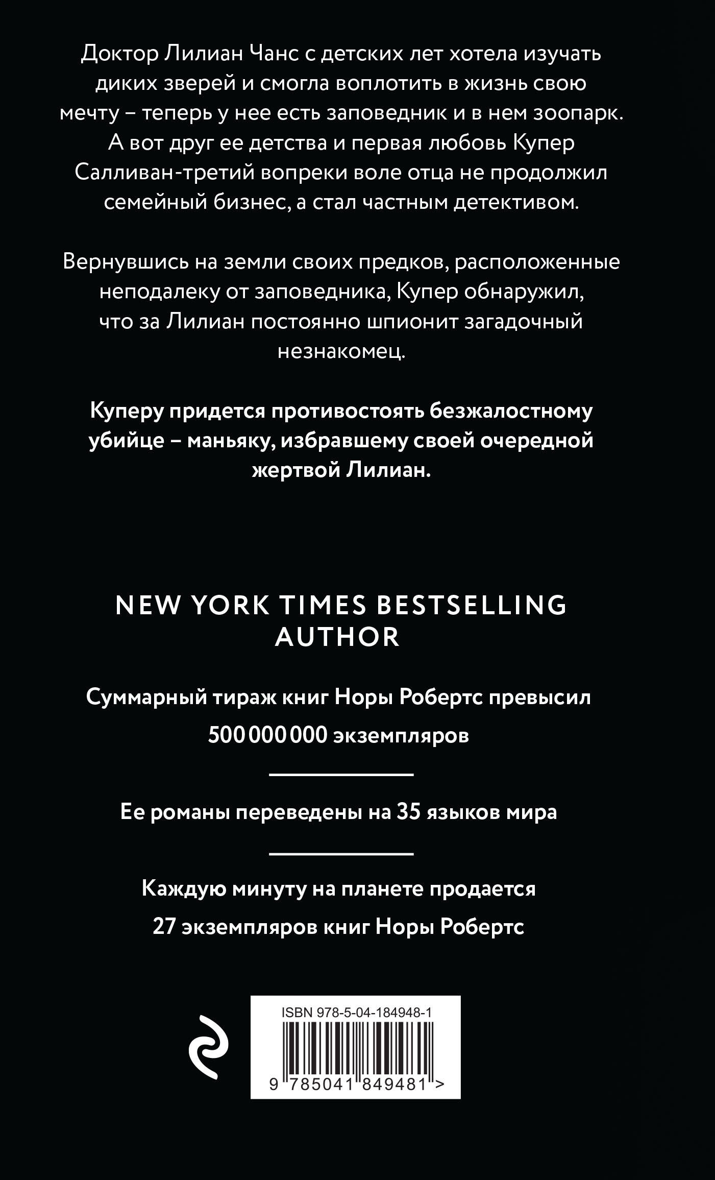 Бестселлер легендарной Норы Робертс в новом переводе. Суммарный тираж книг Норы Робертс превысил 500 млн экземпляров. Ее романы переведены на 35 языков мира. Каждую минуту на планете продается 27 экземпляров книг Норы Робертс. Доктор Лилиан Чанс с детских лет хотела изучать диких зверей и смогла воплотить в жизнь свою мечту - теперь у нее есть заповедник и в нем зоопарк. А вот друг ее детства и первая любовь Купер Салливан-третий вопреки воле отца не продолжил семейный бизнес, а стал частным детективом. Вернувшись на земли своих предков, расположенные неподалеку от заповедника, Купер обнаружил, что за Лилиан постоянно шпионит загадочный незнакомец. Куперу придется противостоять безжалостному убийце - маньяку, избравшему своей очередной жертвой Лилиан.| Издательство | ООО "Издательство "Эксмо" |