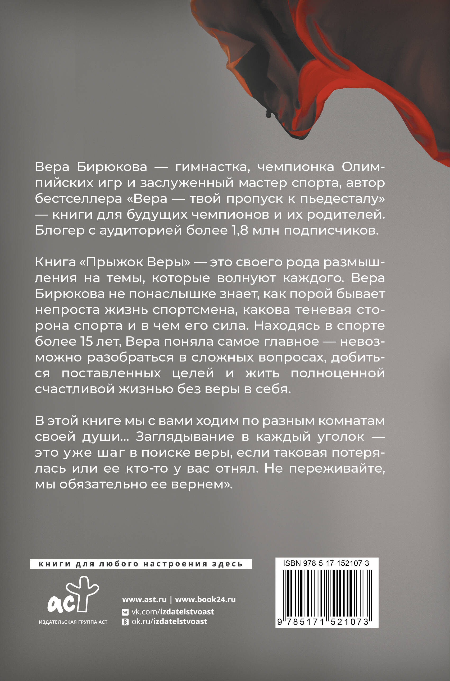 Вера Бирюкова - гимнастка, чемпионка Олимпийских игр и заслуженный мастер спорта, автор бестселлера "Вера - твой пропуск к пьедесталу" -- книги для будущих чемпионов и их родителей. Блогер с аудиторией более 1,8 млн подписчиков. Книга "Прыжок Веры" - это своего рода размышления на темы, которые волнуют каждого. Вера Бирюкова не понаслышке знает, как порой бывает непроста жизнь спортсмена, какова теневая сторона спорта, и в чем его сила. Находясь в спорте более 15 лет, Вера поняла самое главное - невозможно разобраться в сложных вопросах, добиться поставленных целей и жить полноценной счастливой жизнью без веры в себя. "В этой книге мы с вами ходим по разным комнатам своей души…Заглядывание в каждый уголок - это уже шаг в поиске веры, если таковая потерялась или её кто-то у вас отнял. Не переживайте, мы обязательно её вернём"| Издательство | ИЗДАТЕЛЬСТВО "АСТ" |
