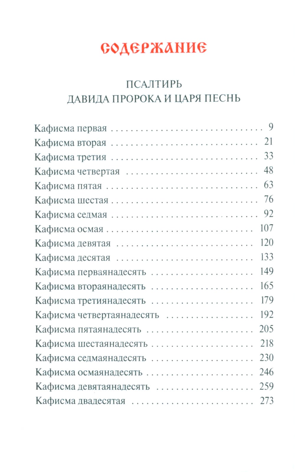 В данную книгу, кроме текста самой Псалтири, включены устав о чтении Псалтири, порядковый и предметный указатель преподобного Арсения Каппадокийского для чтения псалмов на всякую потребу, мирской чин литии и канон на разлучение души от тела. Все эти чинопоследования весьма необходимы мирянам, стремящимся совершать уставное чтение Псалтири с поминанием живых и усопших православных христиан.