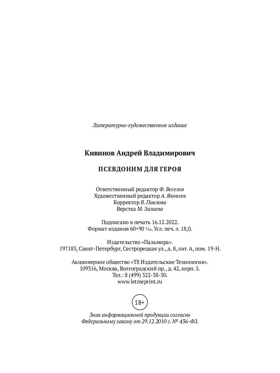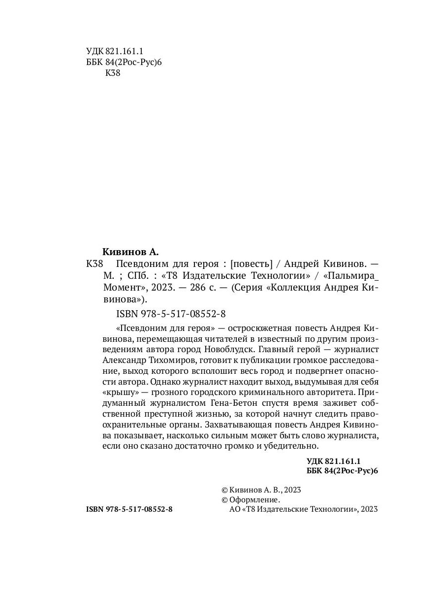 "Псевдоним для героя" - остросюжетная повесть Андрея Кивинова, перемещающая читателей в известный по другим произведениям автора город Новоблудск. Главный герой - журналист Александр Тихомиров, готовит к публикации громкое расследование, выход которого всполошит весь город и подвергнет опасности автора. Однако журналист находит выход, выдумывая для себя "крышу" - грозного городского криминального авторитета. Придуманный журналистом Гена-Бетон спустя время заживет собственной преступной жизнью, за которой начнут следить правоохранительные органы. Захватывающая повесть Андрея Кивинова показывает, насколько сильным может быть слово журналиста, если оно сказано достаточно громко и убедительно.| Издательство | Т8 RUGRAM |
