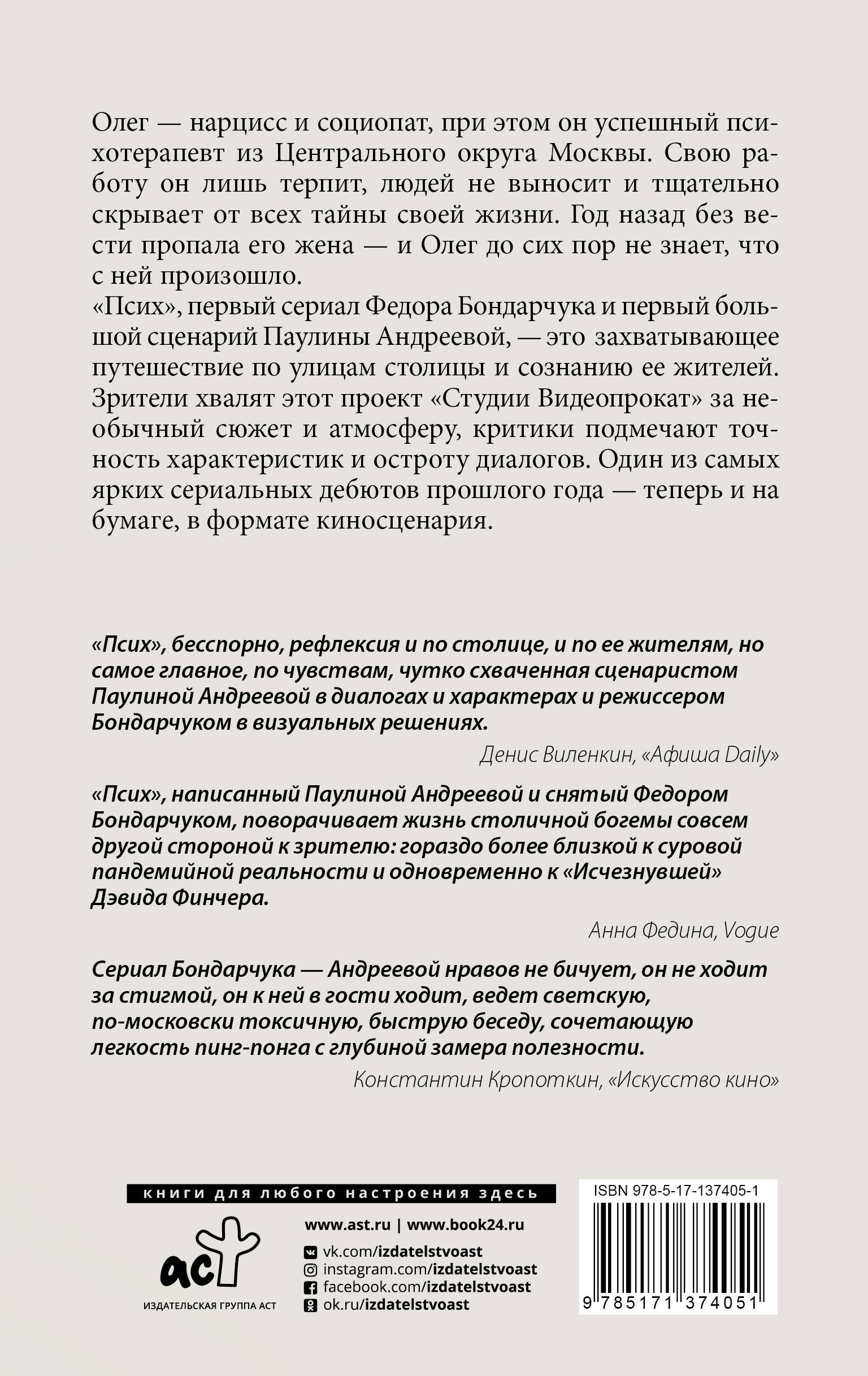 «Псих», первый сериал Фёдора Бондарчука и первый большой сценарий Паулины Андреевой, - это захватывающее путешествие по улицам столицы и сознанию ее жителей. Зрители хвалят этот проект «Студии Видеопрокат» за необычный сюжет и атмосферу, критики подмечают точность характеристик и остроту диалогов. Один из самых ярких сериальных дебютов прошлого года - теперь и на бумаге, в формате киносценария. «Псих», бесспорно, рефлексия и по столице, и по ее жителям, но самое главное, по чувствам, чутко схваченная сценаристом Паулиной Андреевой в диалогах и характерах и режиссером Бондарчуком в визуальных решениях». Денис Виленкин, "Афиша Daily" «Псих», написанный Паулиной Андреевой и снятый Федором Бондарчуком, поворачивает жизнь столичной богемы совсем другой стороной к зрителю: гораздо более близкой к суровой пандемийной реальности и одновременно к «Исчезнувшей» Дэвида Финчера». Анна Федина, Vogue Сериал Бондарчука - Андреевой нравов не бичует, он не ходит за стигмой, он к ней в гости ходит, ведет светскую, по-московски токсичную, быструю беседу, сочетающую легкость пинг-понга с глубиной замера полезности. Константин Кропоткин, "Искусство кино"