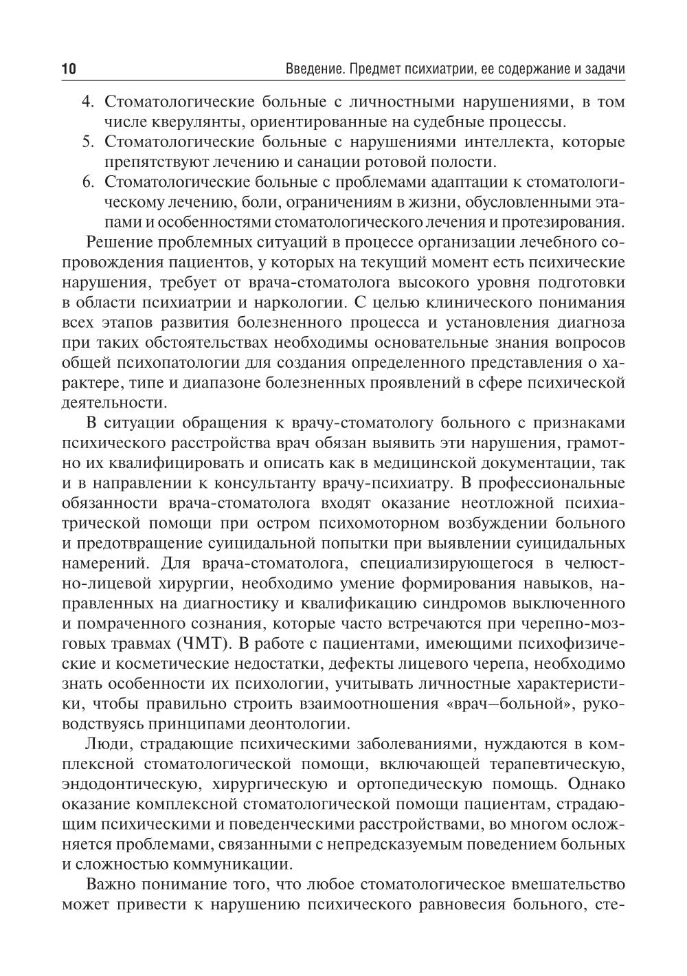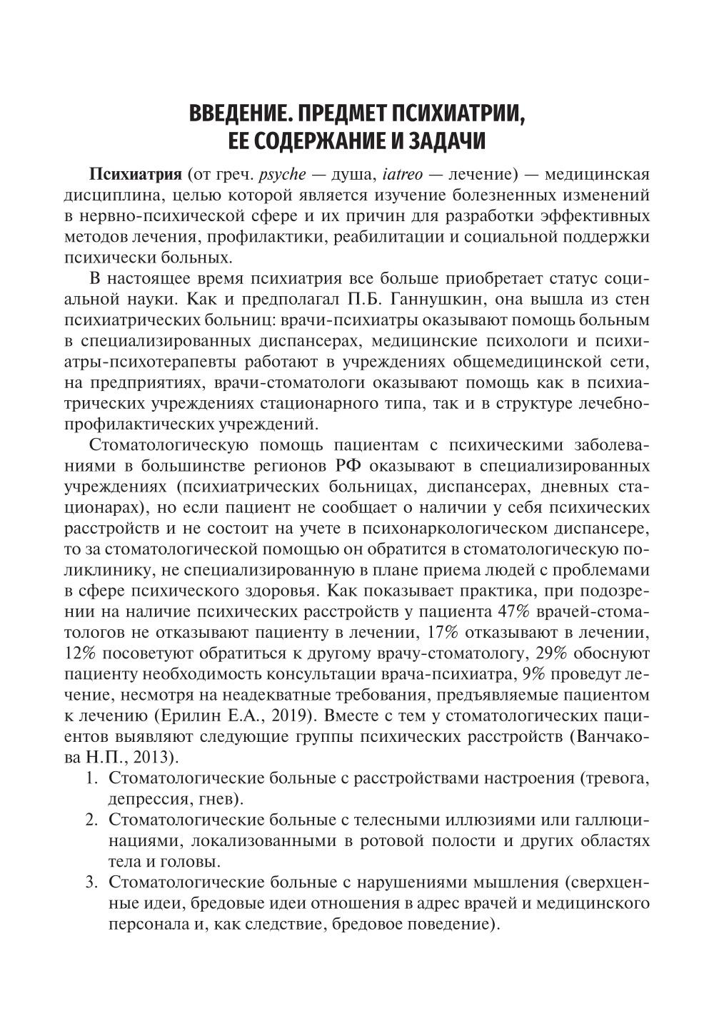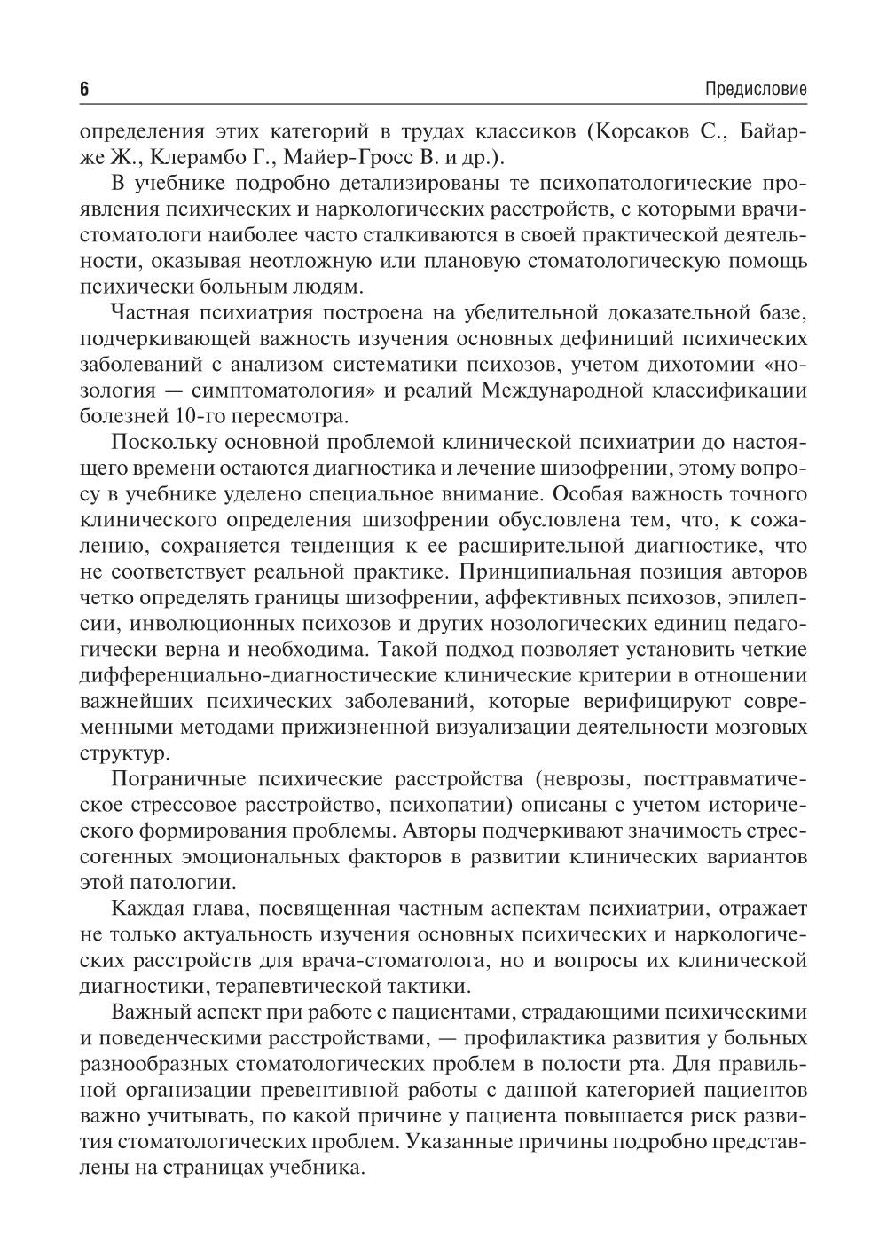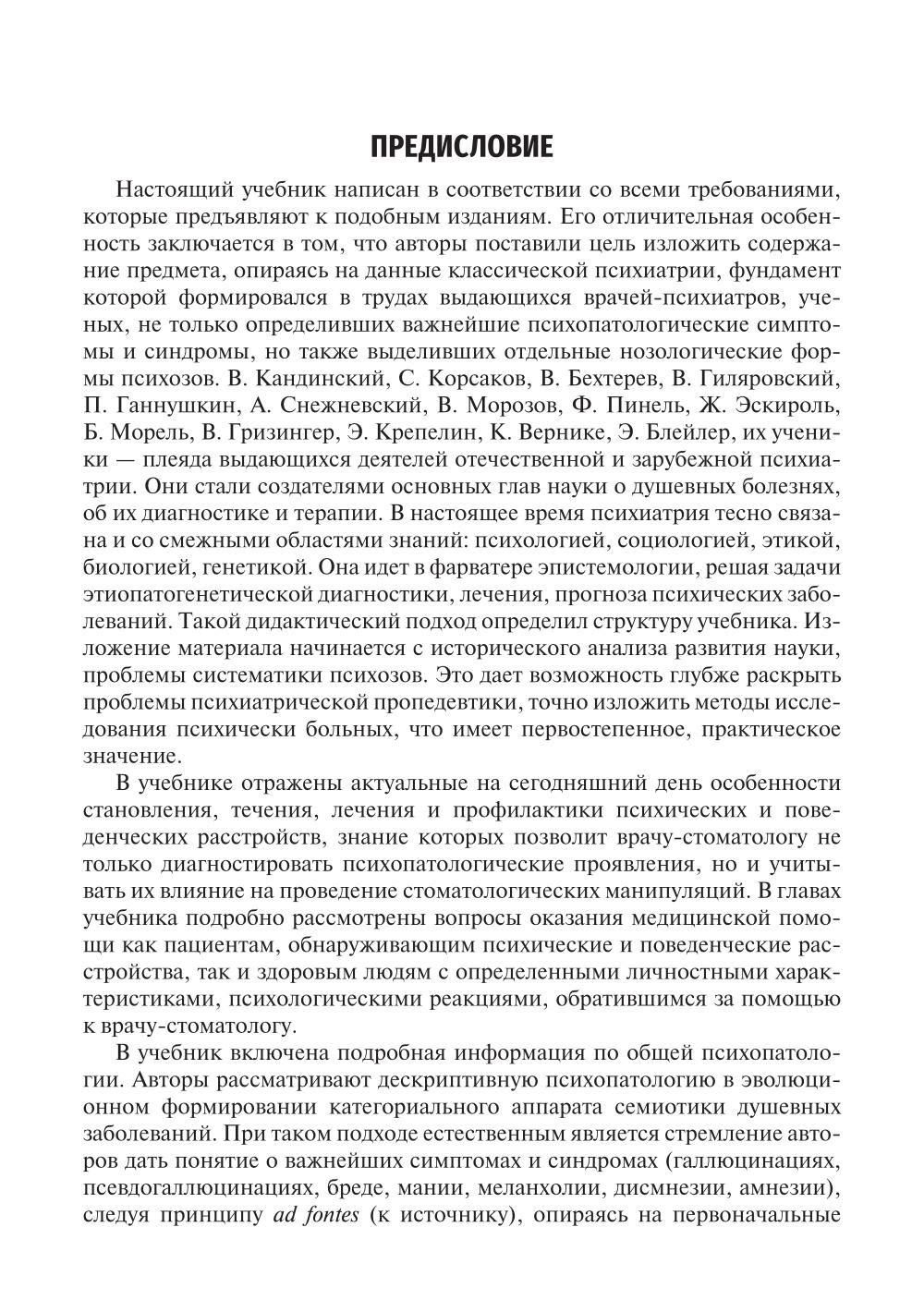 Учебник соответствует требованиям действующего федерального государственного образовательного стандарта по программе «Психиатрия и наркология». Он содержит информацию о трудах выдающихся врачей-психиатров и ученых, которые не только определили важнейшие психопатологические симптомы и синдромы, но и выделили отдельные нозологические формы психозов. В учебнике отражены особенности эмоциональных, волевых, поведенческих, когнитивных и других проявлений психических расстройств у пациентов, встречающихся в практической работе врача-стоматолога, а также современные представления о механизмах возникновения, особенностях течения, принципах лечения и профилактики психических расстройств, знание которых необходимо врачу-стоматологу для оказания квалифицированной помощи таким пациентам. В главах общей психопатологии рассматриваются описание симптомов болезней с точки зрения истории формирования этой области знаний. Частная психиатрия последовательно доказывает важность четких определений психических заболеваний; здесь анализируются системы классификации психозов с учетом ключевого противоречия между нозологическим и симптоматическим подходами, а также с оглядкой на современные стандарты Международной классификации болезней 10-го пересмотра. Особое внимание в учебнике уделено диагностике и лечению шизофрении. Кроме того, подробно описаны пограничные психические расстройства, такие как неврозы, посттравматическое стрессовое расстройство и расстройства личности. Издание предназначено студентам медицинских вузов, обучающихся по основной профессиональной образовательной программе по специальности 31.05.03 «Стоматология».| Издательство | ГЭОТАР-Медиа |