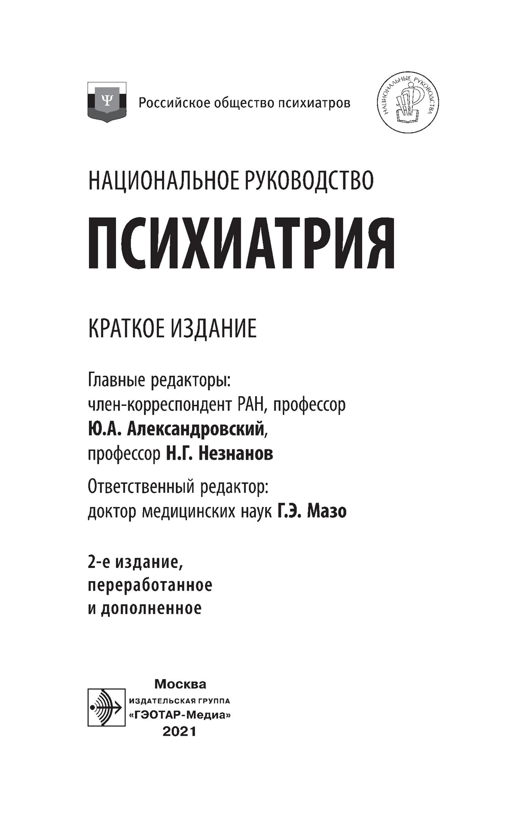 Издание представляет собой сокращенную версию второго выпуска книги «Психиатрия. Национальное руководство», вышедшей в 2018 г. под эгидой Российского общества психиатров и Ассоциации медицинских обществ по качеству.