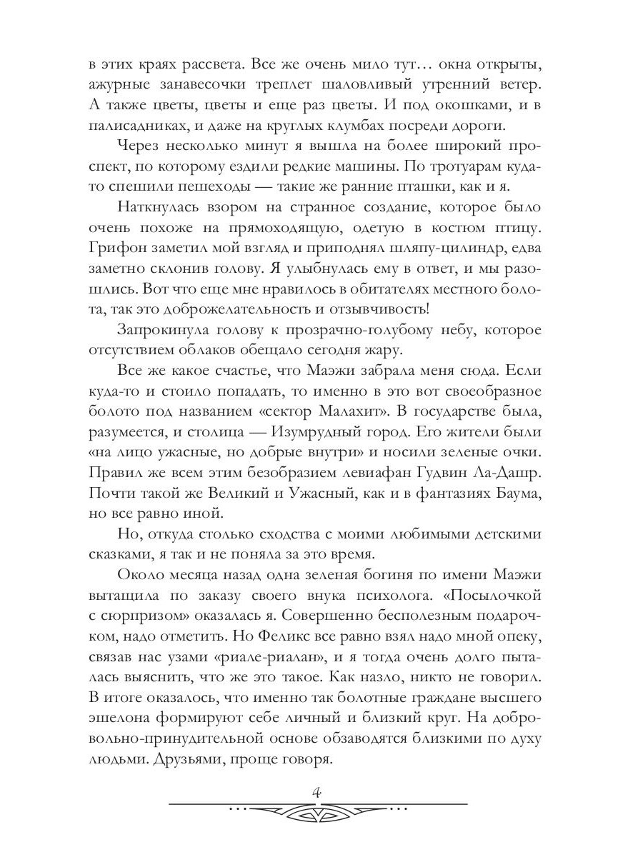 И снова в Изумрудном городе кипят страсти, а обитатели местного Болота теряют покой. Да и о каком покое может идти речь, если местные чешуйчатые и хвостатые «прекрасные дамы» теряют разум от любви к… эльфам, а Хозяин Золотого града и Стальной Кардинал плетут интриги? Но на страже психического здоровья сограждан уверенно стоит психолог Юлия Аристова. Ей предстоит не только помочь им справиться с проблемами, но и самой избавиться от магического проклятия, разоблачить козни врагов и, конечно, одержать победу на личном фронте. Казалось бы, задачи почти невыполнимые. Но нет ничего невозможного для земной девушки, особенно если среди ее друзей самые влиятельные и самые жуткие существа болотного мира.| Издательство | Т8 RUGRAM |