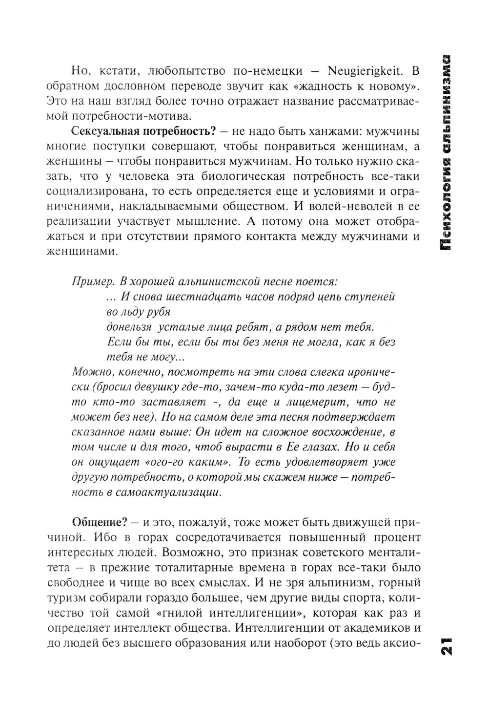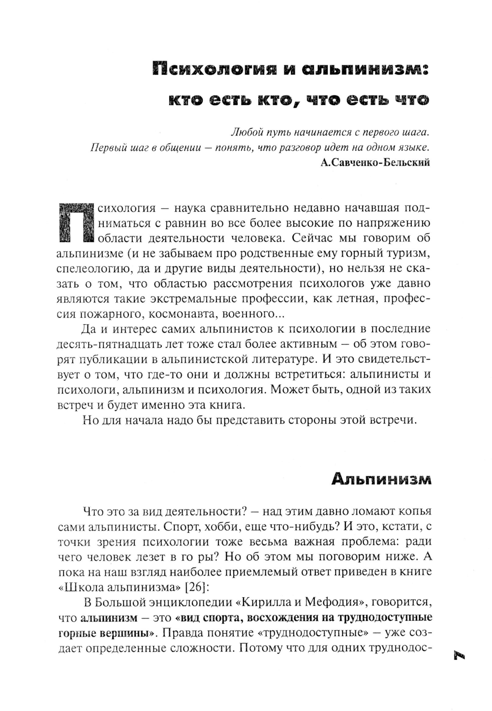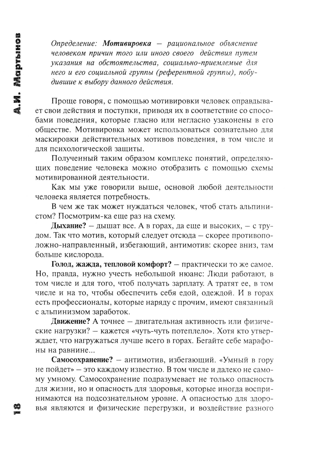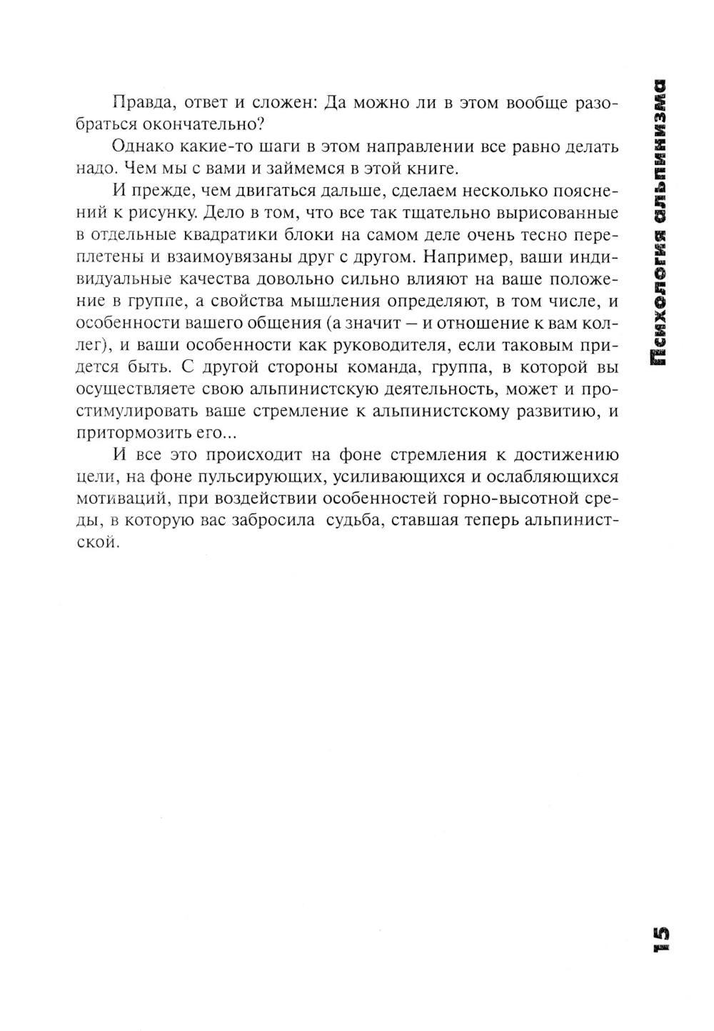 Книга посвящена вопросам применения психологии для анализа и оптимизации деятельности человека в горах. Приведено большое количество реальных примеров различных психологических ситуаций, даны рекомендации по применению в практике альпинистских групп приемов взаимного и аутогенного психологического воздействия. Для альпинистов, горных туристов, спелеологов, тренеров по этим видам спорта, спасателей, и всех, интересующихся вопросами психологии экстремальной деятельности.| Издательство | ТВТ Дивизион |