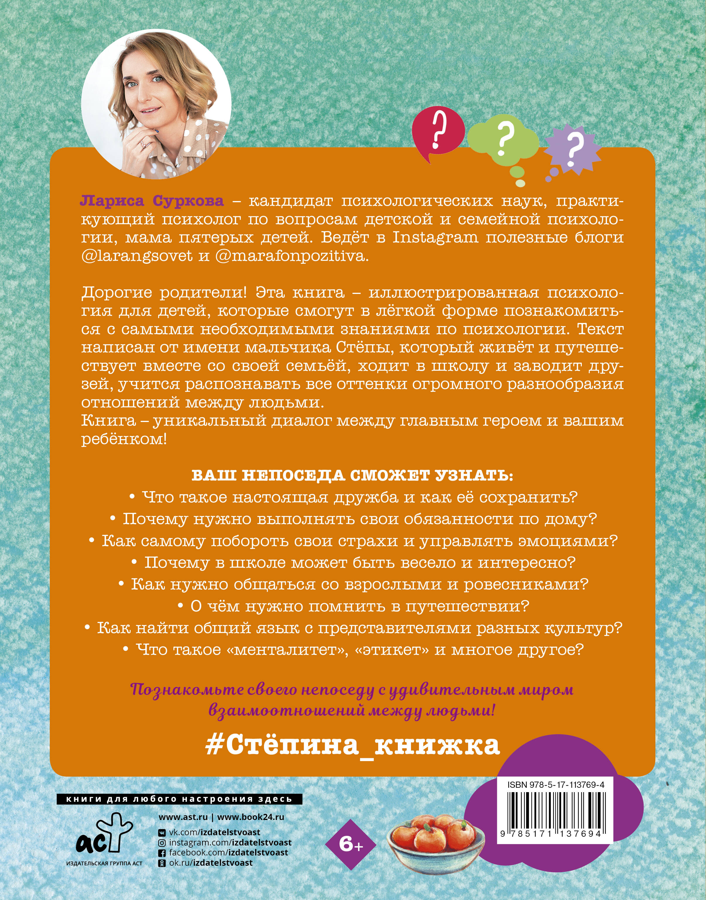 Лариса Суркова - кандидат психологических наук, практикующий психолог по вопросам детской и семейной психологии, мама пятерых детей. Ведет в Instagram полезные блоги @larangsovet и @marafonpozitiva. Психология для детей, первые навыки общения в коллективе, понятия дружбы и любви, обязанности и игры - всё это неотъемлемая часть жизни каждого ребенка. И чтобы научиться правильно вести себя в любой жизненной ситуации, малыш уже сейчас должен знать очень многое о взаимоотношениях в обществе. Лариса Суркова через реальные истории и переживания героев книги расскажет психологические истины, которые так важно знать вашему ребенку, чтобы чувствовать себя уверенно в нашей жизни!| Издательство | ИЗДАТЕЛЬСТВО "АСТ" |