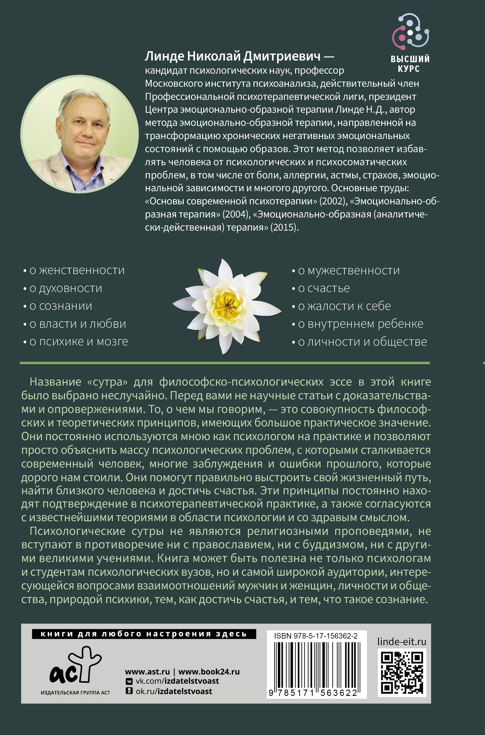 Название "сутра" для философско-психологических эссе в этой книге было выбрано неслучайно. Перед вами не научные статьи с доказательствами и опровержениями. То, о чем мы говорим, - это совокупность философских и теоретических принципов, имеющих большое практическое значение. Они постоянно используются мною как психологом на практике и позволяют просто объяснить массу психологических проблем, с которыми сталкивается современный человек, многие заблуждения и ошибки прошлого, которые дорого нам стоили. Они помогут правильно выстроить свой жизненный путь, найти близкого человека и достичь счастья. Эти принципы постоянно находят подтверждение в психотерапевтической практике, а также согласуются с известнейшими теориями в области психологии и со здравым смыслом. Психологические сутры не являются религиозными проповедями, не вступают в противоречие ни с православием, ни с буддизмом, ни с другими великими учениями. Книга может быть полезна не только психологам и студентам психологических вузов, но и самой широкой аудитории, интересующейся вопросами взаимоотношений мужчин и женщин, личности и общества, природой психики, тем, как достичь счастья, и тем, что такое сознание.| Издательство | ИЗДАТЕЛЬСТВО "АСТ" |