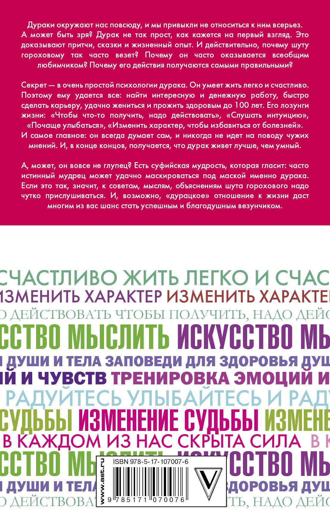 ься к ним всерьез. А может быть зря? Дурак не так прост, как кажется на первый взгляд. Это доказывают притчи, сказки и жизненный опыт. И действительно, почему шуту гороховому так часто везет? Почему он часто оказывается всеобщим любимчиком? Почему его действия получаются самыми правильными? Секрет - в очень простой психологии дурака. Он умеет жить легко и счастливо. Поэтому ему удается все: найти интересную и денежную работу, быстро сделать карьеру, удачно жениться и прожить здоровым до 100 лет. Его лозунги жизни: "Чтобы что-то получить, надо действовать", "Слушать интуицию", "Почаще улыбаться", "Изменить характер, чтобы избавиться от болезней". И самое главное: он всегда думает сам, и никогда не идет на поводу чужих мнений. И, в конце концов, получается, что дурак живет лучше, чем умный. А, может, он вовсе не глупец? Есть суфийская мудрость, которая гласит: часто истинный мудрец может удачно маскироваться под маской именно дурака. Если это так, значит, к советам, мыслям, объяснениям шута горохового надо чутко прислушиваться. И, возможно, "дурацкое" отношение к жизни даст многим из вас шанс стать успешным и благодушным везунчиком.| Издательство | Издательство "АСТ" |
