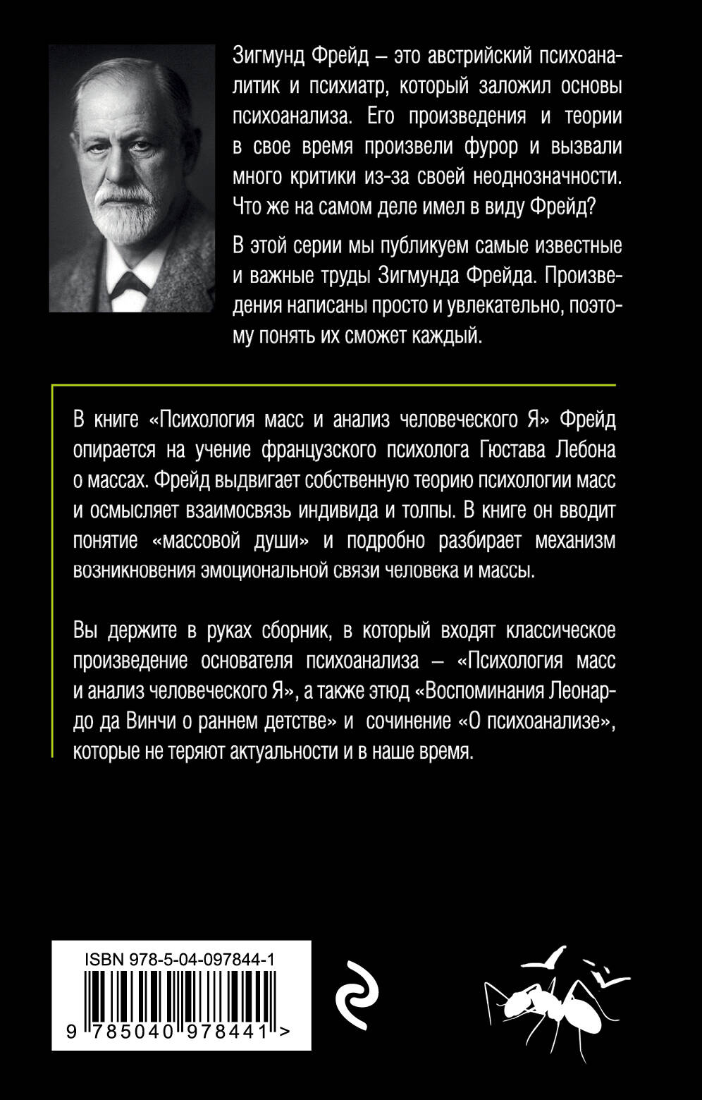Зигмунд Фрейд - это австрийский психоаналитик и психиатр, который заложил основы психоанализа. Его произведения и теории в свое время произвели фурор и вызвали много критики из-за своей неоднозначности. Что же на самом деле имел в виду Фрейд? В этой серии мы публикуем самые известные и важные труды Зигмунда Фрейда. Произведения написаны просто и увлекательно, поэтому понять их сможет каждый. В книге «Психология масс и анализ человеческого Я» Фрейд опирается на учение французского психолога Гюстава Лебона о массах. Фрейд выдвигает собственную теорию психологии масс и осмысляет взаимосвязь индивида и толпы. В книге он вводит понятие «массовой души» и подробно разбирает механизм возникновения эмоциональной связи человека и массы. Вы держите в руках сборник, в который входят классическое произведение основателя психоанализа - «Психология масс и анализ человеческого Я», а также этюд «Леонардо да Винчи» и сочинение «О психоанализе», которые не теряют актуальности и в наше время.| Издательство | ООО "Издательство "Эксмо" |
