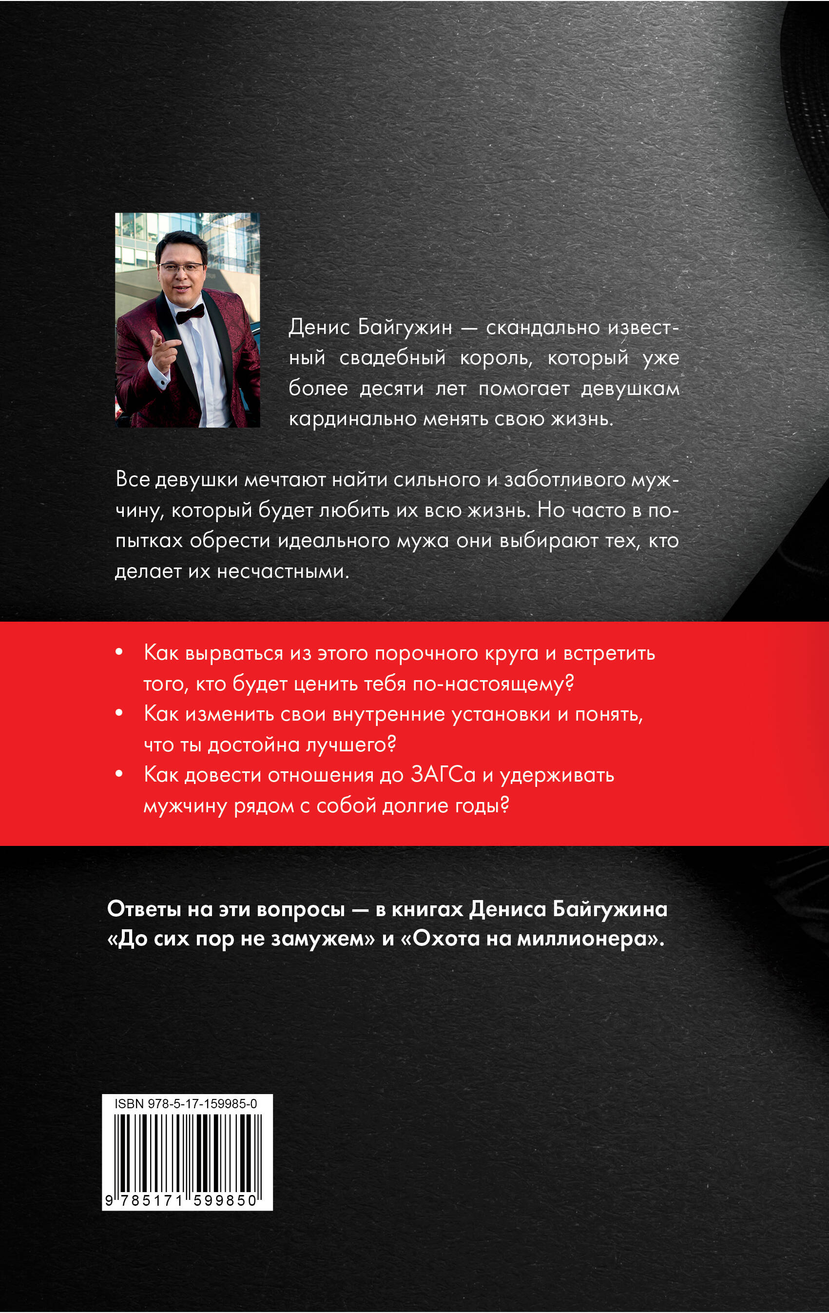 Денис Байгужин - скандально известный свадебный король, который уже более десяти лет помогает девушкам кардинально менять свою жизнь. Все девушки мечтают найти сильного и заботливого мужчину, который будет любить их всю жизнь. Но часто в попытках обрести идеального мужа они выбирают тех, кто делает их несчастными. • Как вырваться из этого порочного круга и встретить того, кто будет ценить тебя по-настоящему? • Как изменить свои внутренние установки и понять, что ты достойна лучшего? • Как довести отношения до ЗАГСа и удерживать мужчину рядом с собой долгие годы? Ответы на эти вопросы - в книгах Дениса Байгужина "До сих пор не замужем" и "Охота на миллионера".| Издательство | ИЗДАТЕЛЬСТВО "АСТ" |