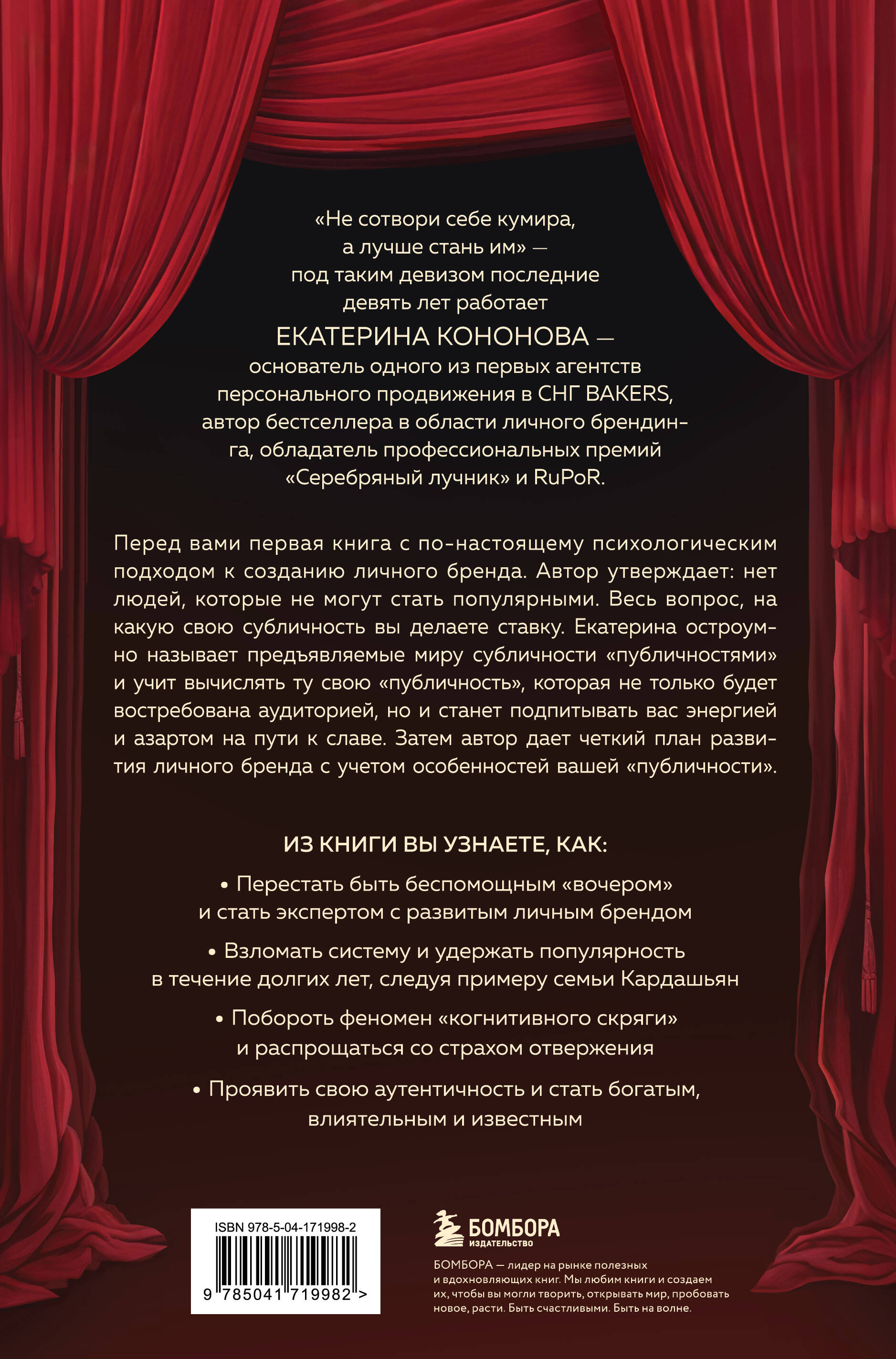 «Не сотвори себе кумира, а лучше стань им» - под таким девизом последние девять лет работает Екатерина Кононова, основатель одного из первых агентств персонального продвижения в СНГ - BAKERS, автор бестселлера в области личного брендинга, обладатель профессиональных премий «Серебряный лучник» и RuPoR. Перед вами первая книга с по-настоящему психологическим подходом к созданию личного бренда. Автор утверждает: нет людей, которые не могут стать популярными. Весь вопрос, на какую свою субличность вы делаете ставку. Екатерина остроумно называет предъявляемые миру субличности - «публичностями» и учит вычислять ту свою «публичность», которая не только будет востребована аудиторией, но и станет подпитывать вас энергией и азартом на пути к славе. Затем автор дает четкий план развития личного бренда с учетом особенностей вашей «публичности». Из книги вы узнаете, как: • Перестать быть беспомощным «вочером» и стать экспертом с развитым личным брендом. • Взломать систему и удержать популярность в течение долгих лет, следуя примеру семьи Кардашьян. • Побороть феномен «когнитивного скряги» и распрощаться со страхом отвержения. • Проявить свою аутентичность и стать богатым, влиятельным и известным.| Издательство | ООО "Издательство "Эксмо" |