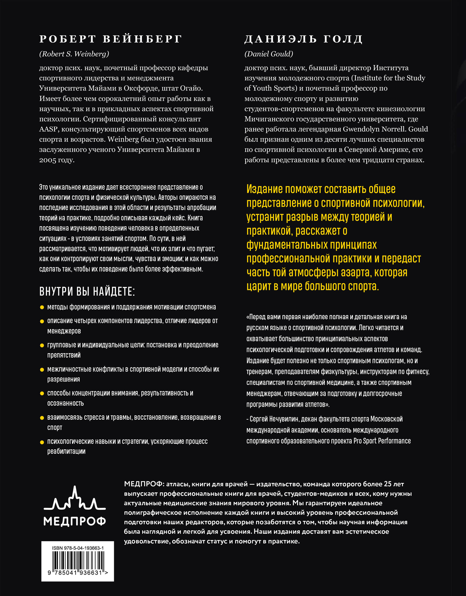 Победа в спорте - это не только результат физических возможностей и натренированности. Огромную роль играет «воля к победе», а проще говоря - психологический аспект. Уникальное восьмое издание «Основ спортивной психологии», написанное всемирно известными авторами Робертом Вайнбергом и Дэниелом Гулдом, дает спортсменам, врачам спортивной медицины, спортивным психологам и психотерапевтам уникальные инструменты для достижения максимально возможных результатов в спорте. Внутри: - истоки спортивной психологии и современные концепции; - научные разработки для преодоления страха; - психологические техники для максимально эффективной работы; - психологическое развитие детей через участие в спорте, агрессию в спорте; - руководства для преодоления ситуационных трудностей в спорте. Это руководство станет базовым для обучения врачей спортивной медицины, спортивных консультантов, спортивных психологов. Также оно может представлять интерес для детских психиатров, педиатров и учителей.| Издательство | ООО "Издательство "Эксмо" |