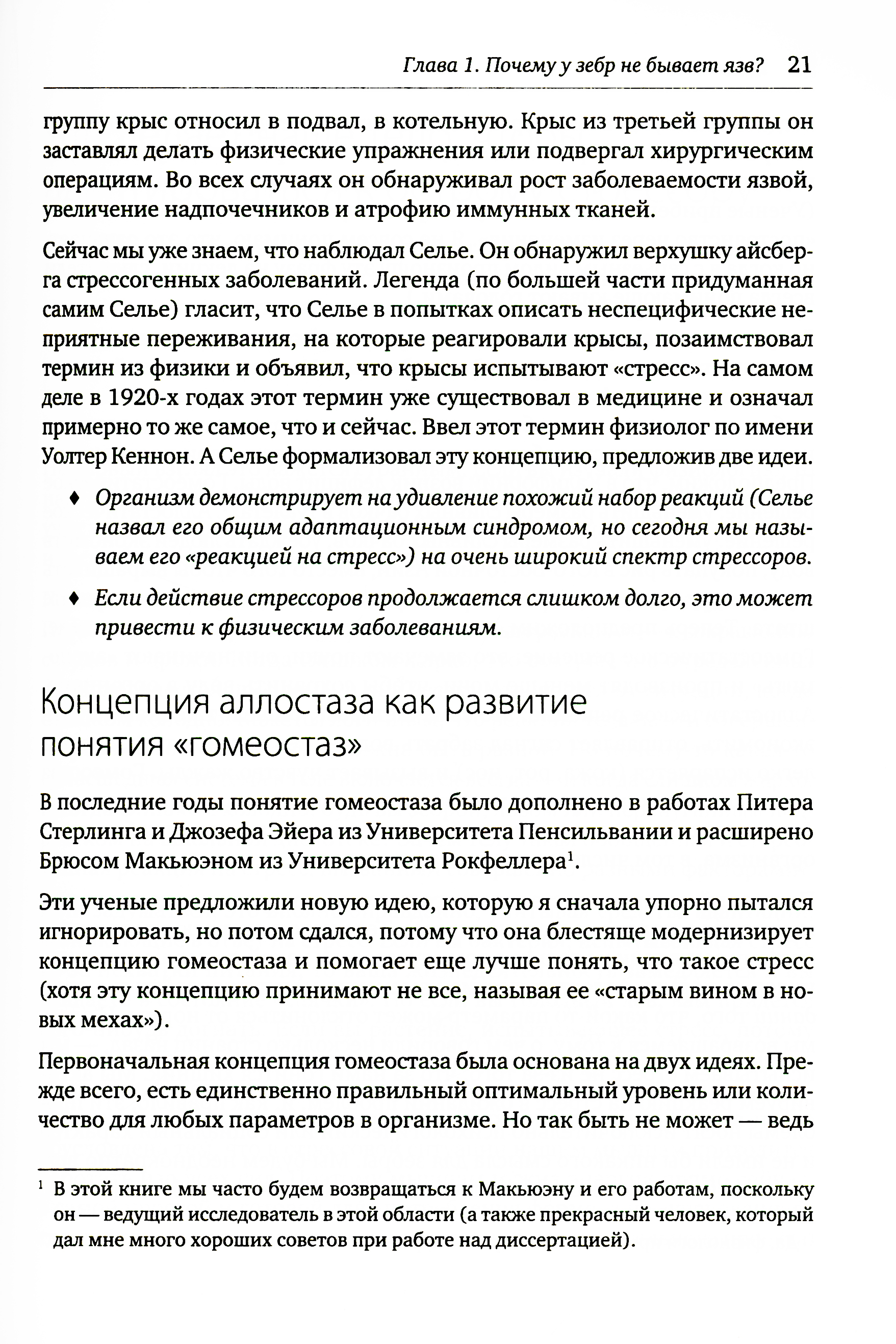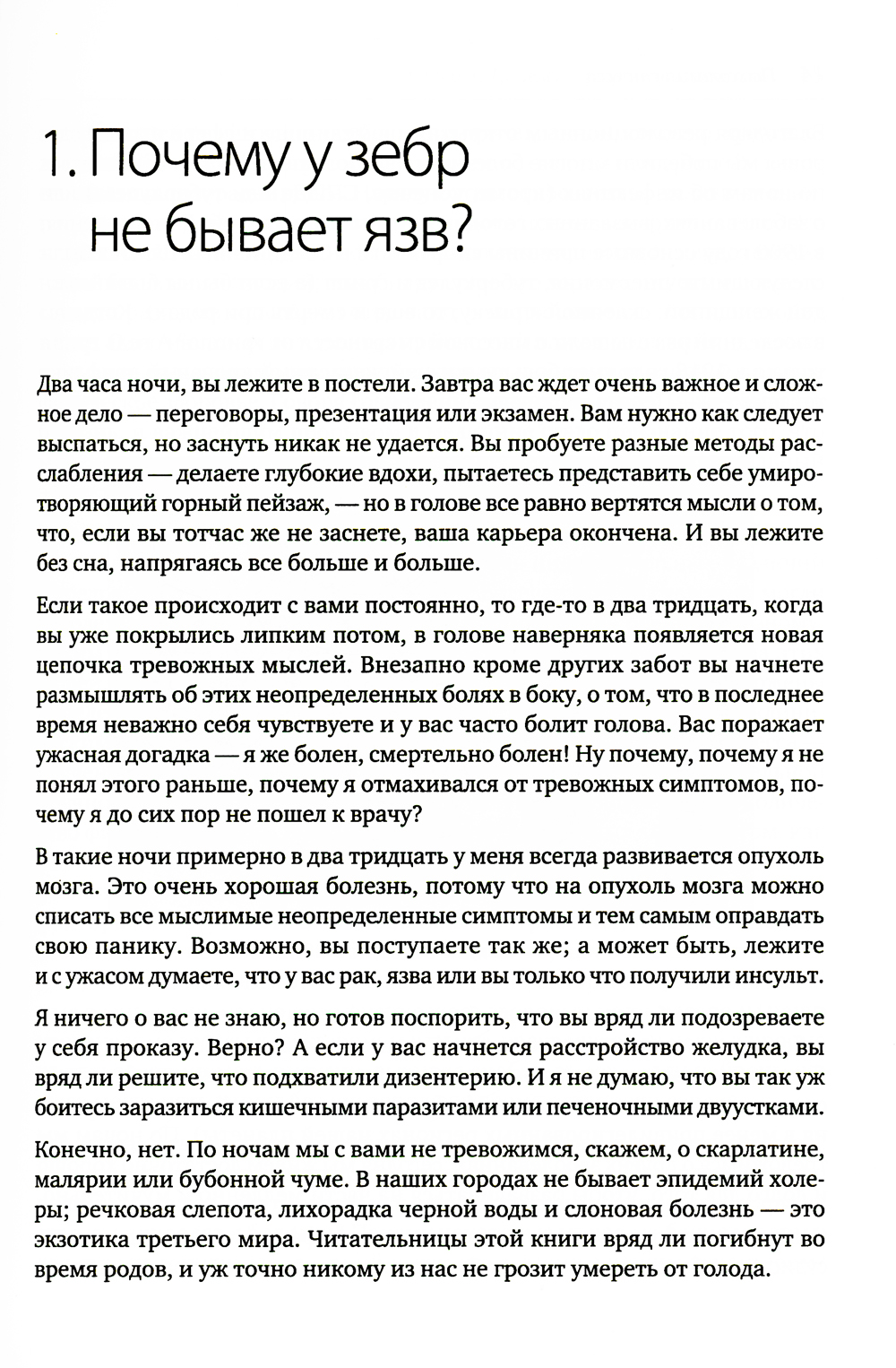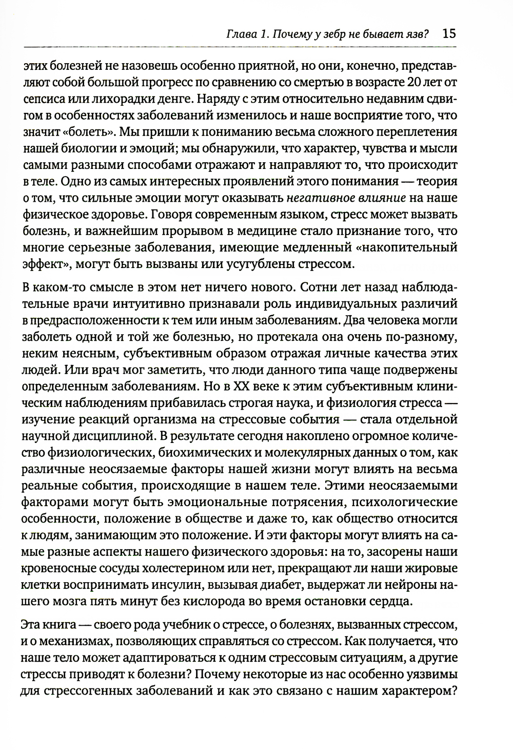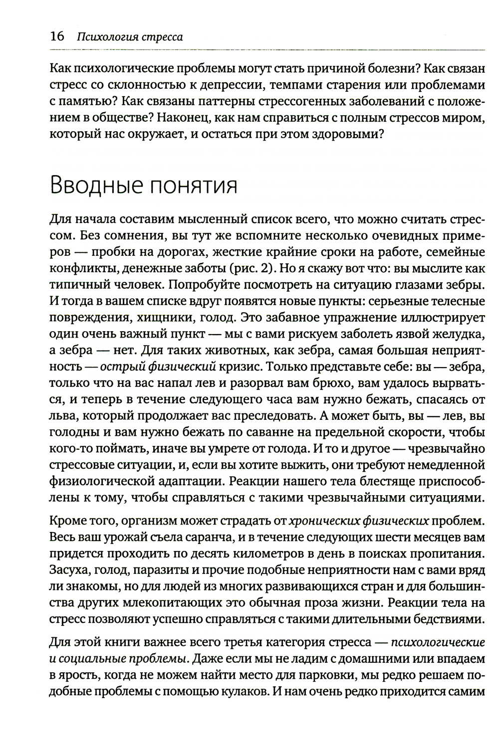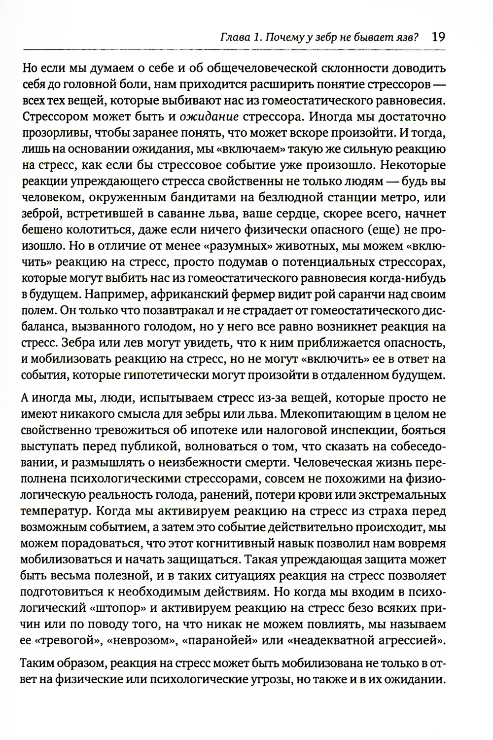 Одна из самых авторитетных и знаменитых во всем мире книг по психологии и физиологии стресса. Ее автор - специалист с мировым именем, выдающийся биолог и психолог Роберт Сапольски убежден, что человеческая способность готовиться к будущему и беспокоиться о нем - это и благословение, и проклятие. Благословение - в превентивном и подготовительном поведении, а проклятие - в том, что наша склонность беспокоиться о будущем вызывает постоянный стресс. Оказывается, эволюционно люди предрасположены реагировать и избегать угрозы, как это делают зебры. Мы должны расслабляться большую часть дня и бегать как сумасшедшие только при приближении опасности. У зебры время от времени возникает острая стрессовая реакция (физические угрозы). У нас, напротив, хроническая стрессовая реакция (психологические угрозы) редко доходит до таких величин, как у зебры, зато никуда не исчезает. Зебры погибают быстро, попадая в лапы хищников. Люди умирают медленнее: от ишемической болезни сердца, рака и других болезней, возникающих из-за хронических стрессовых реакций. Но когда стресс предсказуем, а вы можете контролировать свою реакцию на него, на развитие болезней он влияет уже не так сильно. Эти и многие другие вопросы, касающиеся стресса и управления им, затронуты в замечательной книге профессора Сапольски, которая адресована специалистам психологического, педагогического, биологического и медицинского профилей, а также преподавателям и студентам соответствующих вузовских факультетов.| Издательство | Питер |