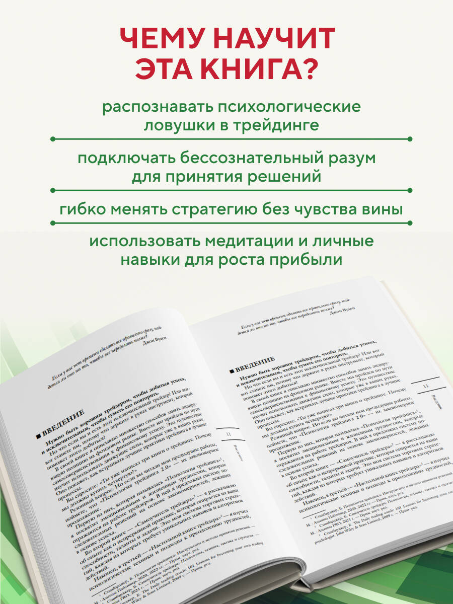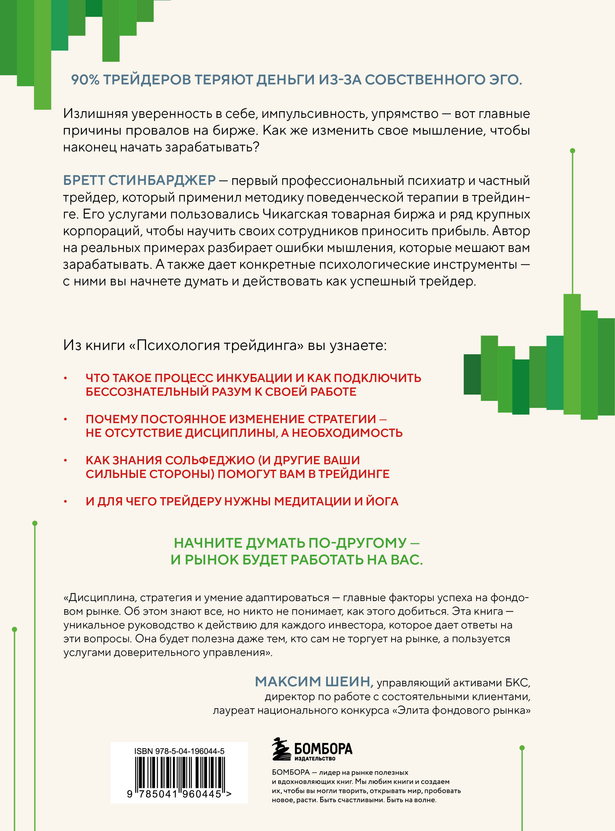 90% трейдеров теряют деньги из-за собственного эго. Излишняя уверенность в себе, импульсивность, упрямство - вот главные причины провалов на бирже. Как же изменить свое мышление, чтобы наконец начать зарабатывать? Бретт Стинбарджер - первый профессиональный психиатр и частный трейдер, который применил методики поведенческой терапии в трейдинге. Его услугами пользовались Чикагская товарная биржа и ряд крупных корпораций, чтобы научить своих сотрудников приносить прибыль. Автор на реальных примерах разбирает ошибки мышления, которые мешают вам зарабатывать. А также дает конкретные психологические инструменты - с ними вы начнете думать и действовать как успешный трейдер. Из книги «Психология трейдинга» вы узнаете: · что такое процесс инкубации и как подключить бессознательный разум к своей работе; · почему постоянное изменение стратегии - не отсутствие дисциплины, а необходимость; · как знания сольфеджио (и другие ваши сильные стороны) помогут вам в трейдинге; · и для чего трейдеру нужны медитации и йога. Начните думать по-другому - и рынок будет работать на вас.| Издательство | ООО "Издательство "Эксмо" |